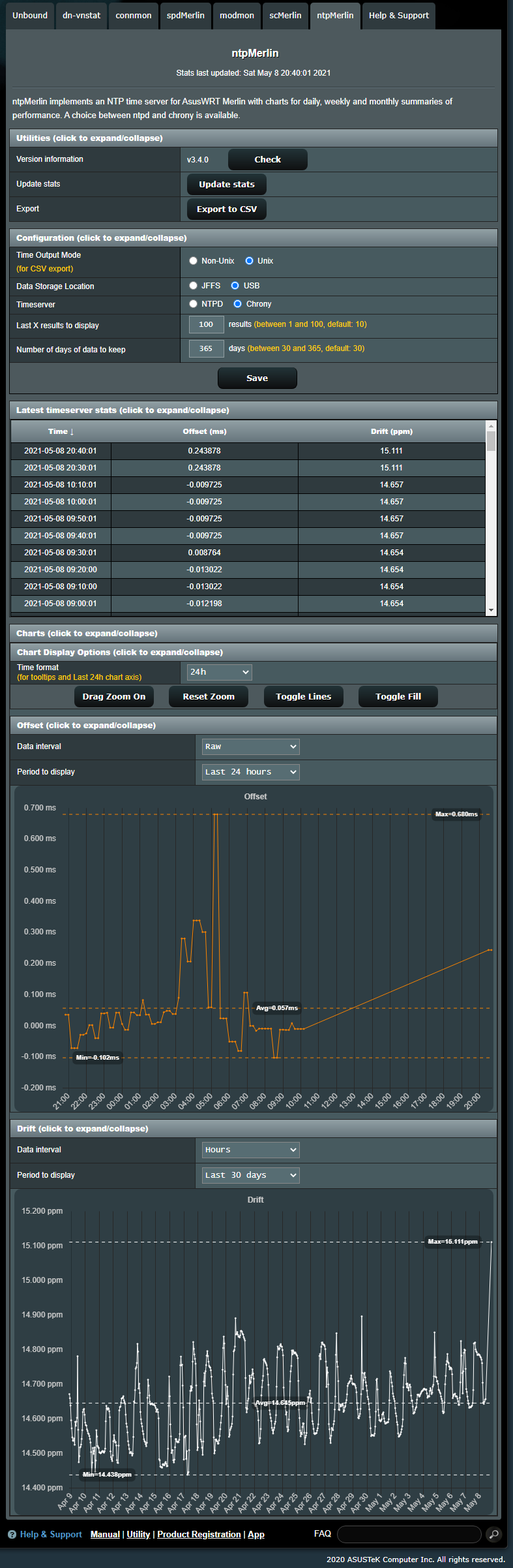 ntpMerlin implements an NTP time server for AsusWRT Merlin with charts for daily, weekly and monthly summaries of performance. A choice between ntpd and chrony is available.