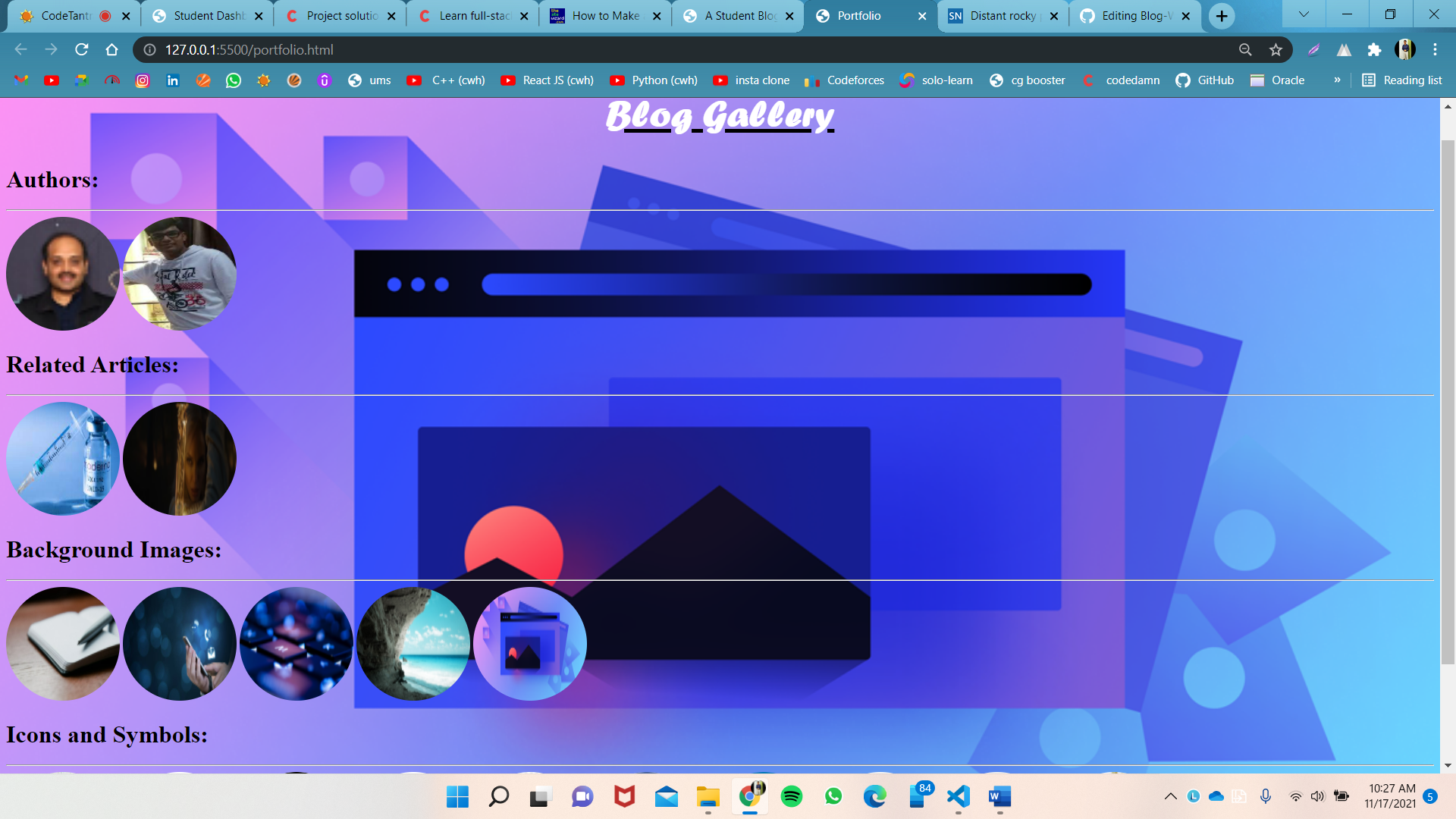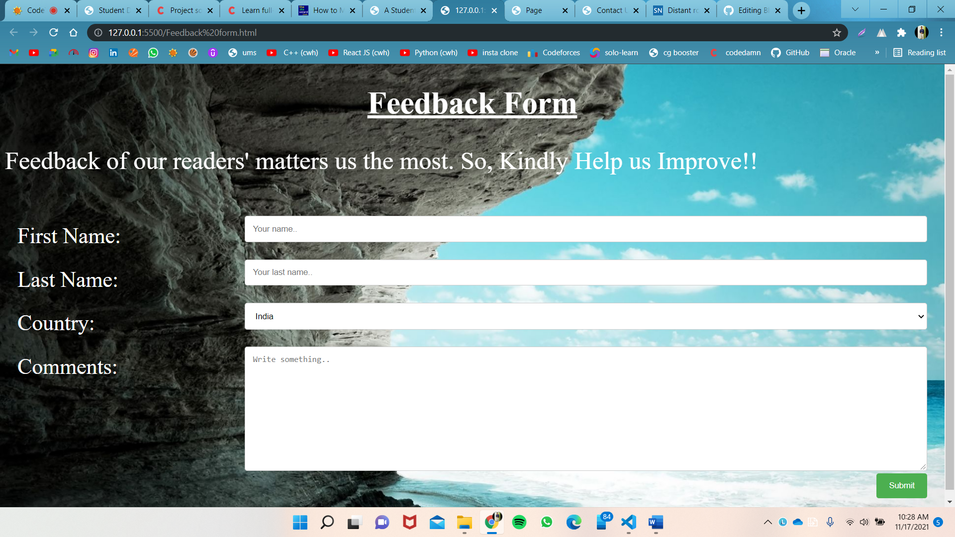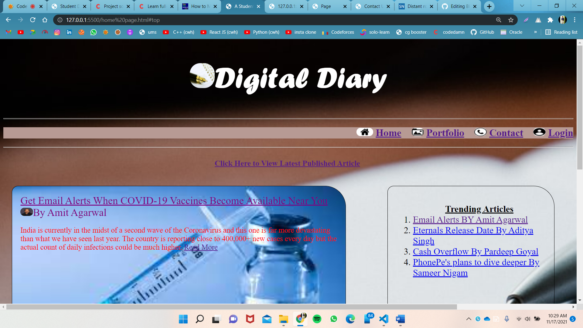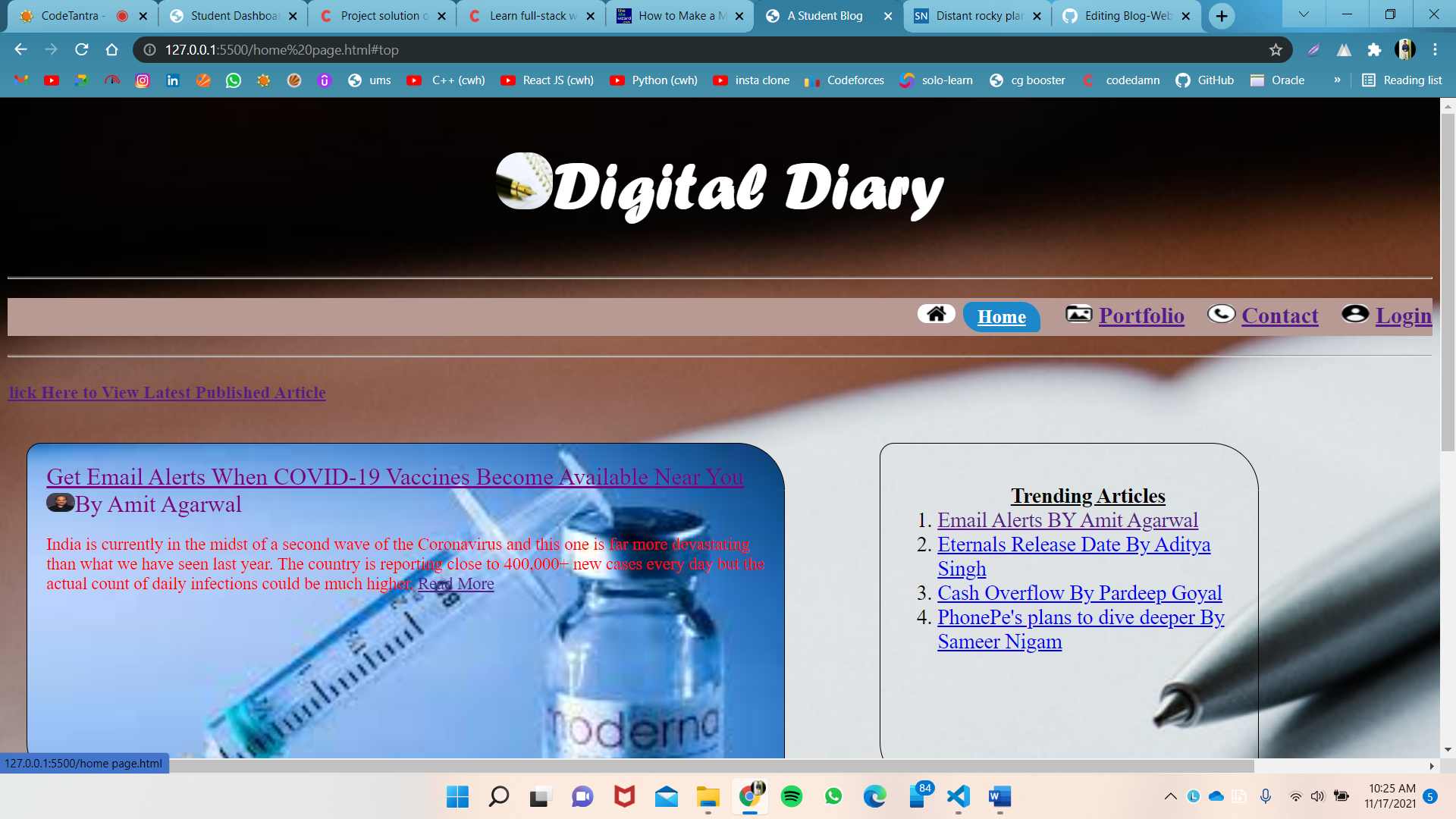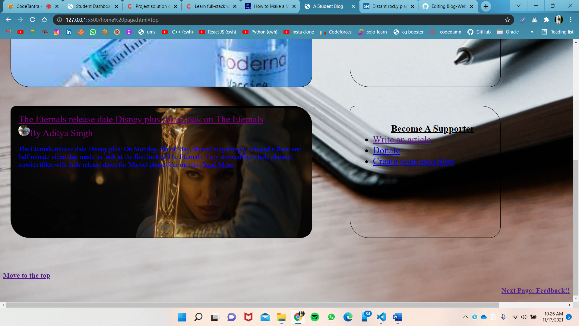 Hello everyone, I am very glad to present my academic skills in the form of a website named as ‘The Blog Website’ . As we know that a blog is a website where a person writes regularly about topics that interest them, usually with photographs and links to other websites they find interesting. There are many renowned Indian as well as International Blog Websites where we can see the most famous writers and authors too expressing their thoughts, ideas and enlightening certain topics that actually becomes the ‘Talk of the Town’ and gathers as many readers as possible. So by exploring my website you will be able to gather upon the basic idea of what a blog website actually look like. The making of this website helped me a lot in exploring the world of blogs. The website is well designed and carved by the skills of coding in the areas of HTML and CSS. I have tried my best to show up my html and css skills by using as many tags and attributes as possible. I have also inserted the images for its fascinating layout to attract the readers and have further attached some latest trending articles of current times. To begin with exploring the website open the 'home page' html file. The website contains a ‘Login page’ where the user can log in and become a regular reader, the ‘Contact page’ refers to every way possible that you can use to contact the developer of the website and at last of the ‘Home page’ of the website we have attached a link that will directly take you the ‘Feedback Form’ fill up where we expect your valuable comments to help us improve better. Further here I have listed all the tags that have been used by me to create this website followed by the ‘Snapshots’ of the output that will give the best possible preview of my website.