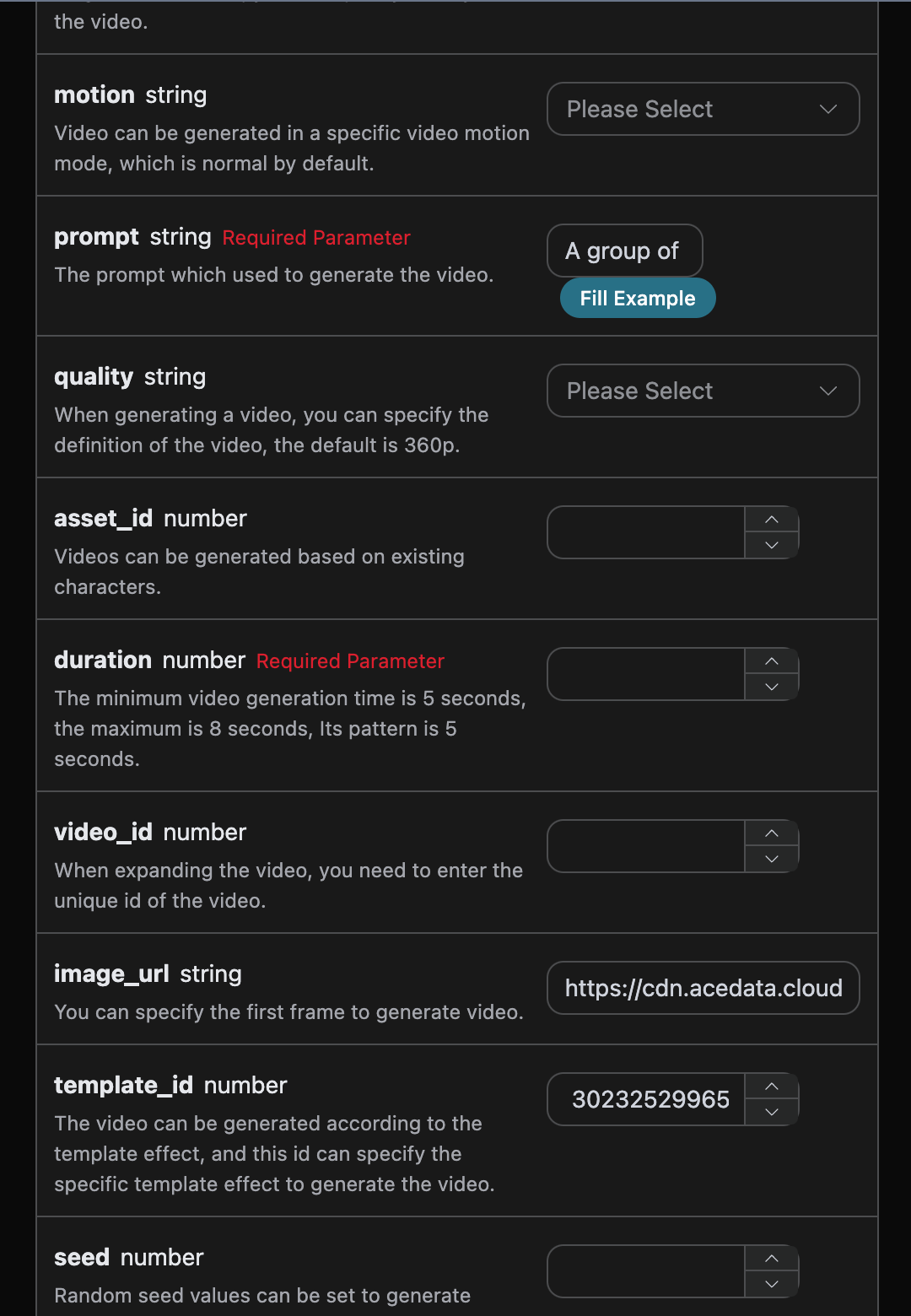 ]We can choose a template_id from above to generate a video, using 302325299651648 as an example to generate the video, with other parameters being similar to basic usage, the specific parameters are shown in the image below:
