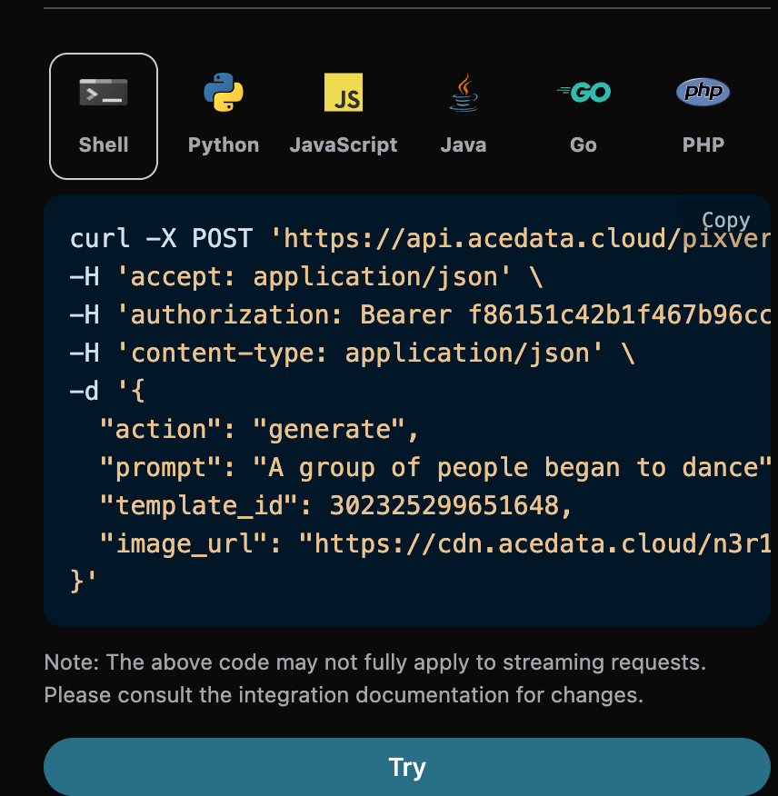 You can click the "Try" button to directly test the API, wait for 1-2 minutes, and the result is as follows: