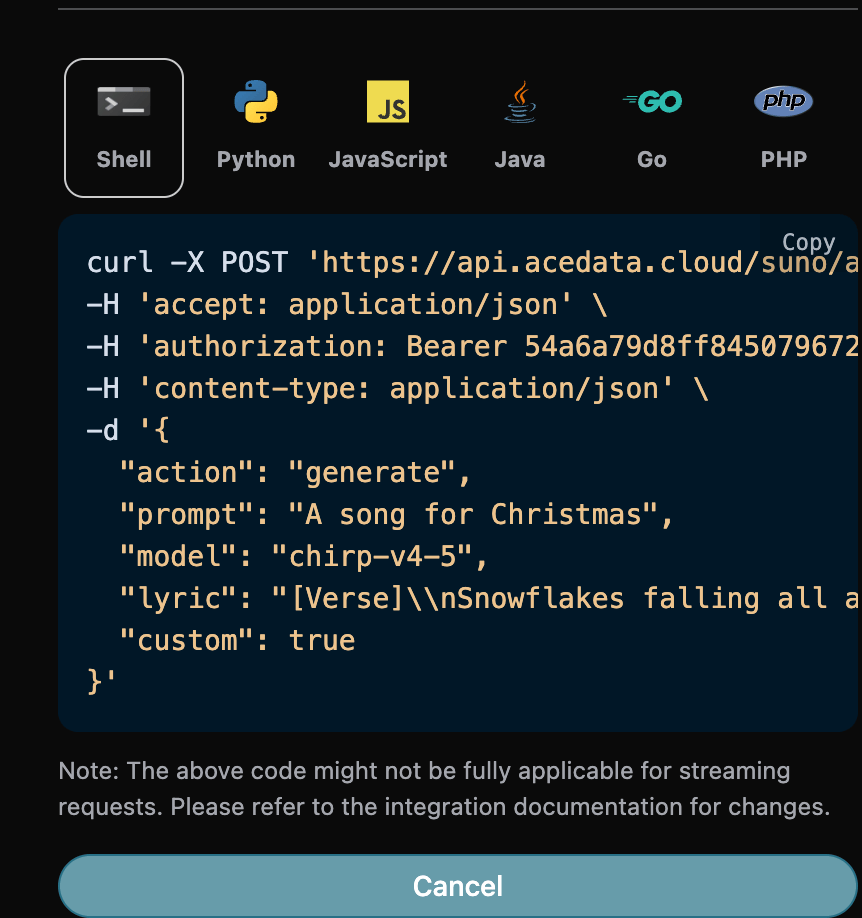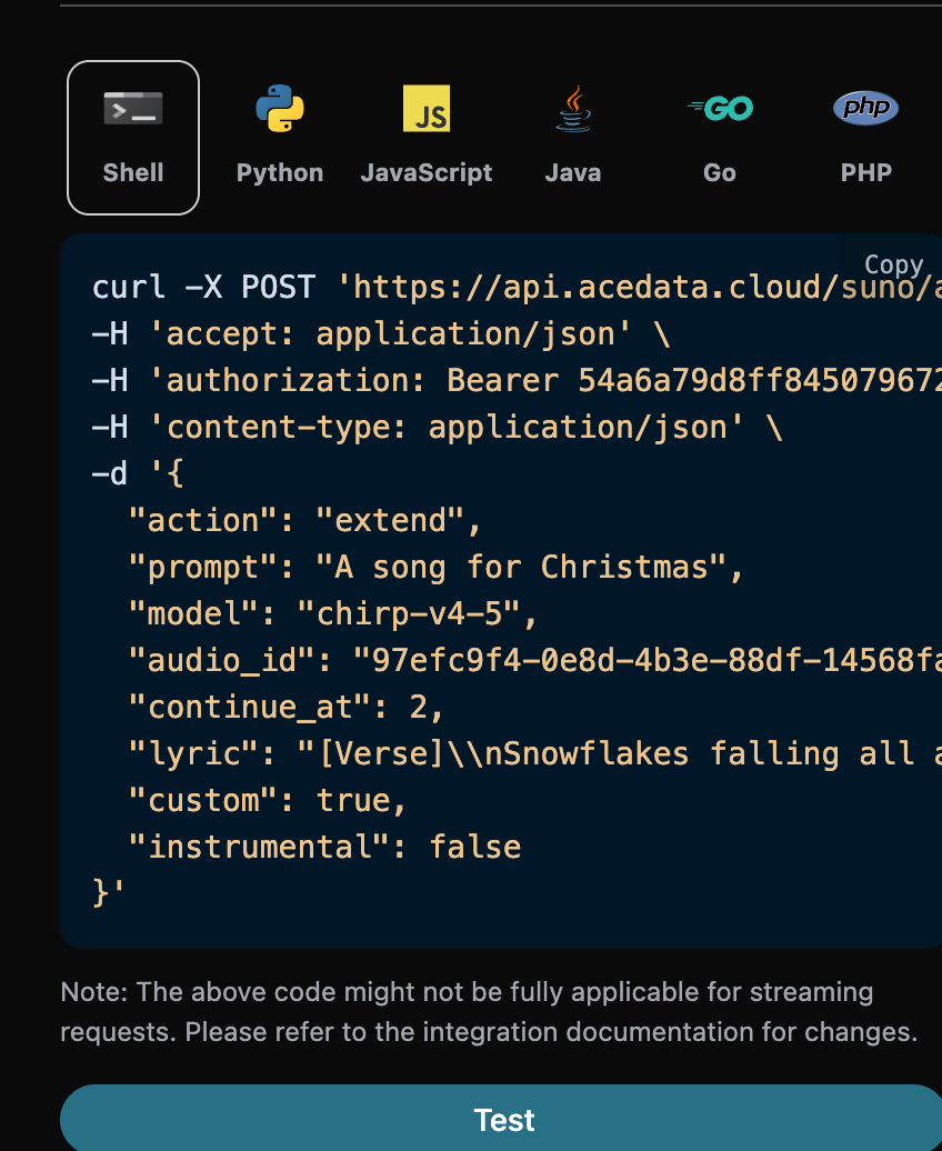However, Suno does not officially provide an API. AceDataCloud offers a set of Suno APIs that simulate the official Suno integration, making it easy and quick to generate the desired music.