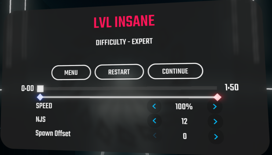 - The Speed, NJS, and spawn offset will reset to that of the song upon starting or restarting the song