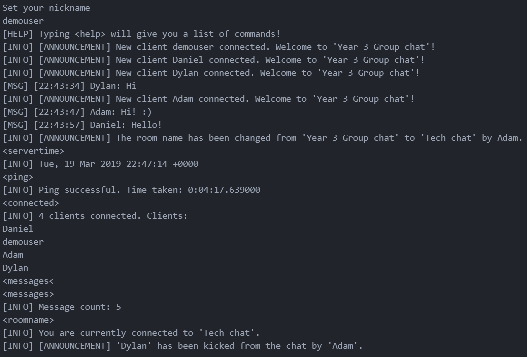 In this project we developed a chat application using Python 2.7. This app will contain a server and numerous clients which will communicate with each other using sockets. Clients will not be able to communicate with each other directly but all messages will be passed to the server which will decide where to send the messages on to. We developed a custom protocol specific to this application that will allow us to pass data and commands between server and clients, extract the command from the message and carry out that instruction.