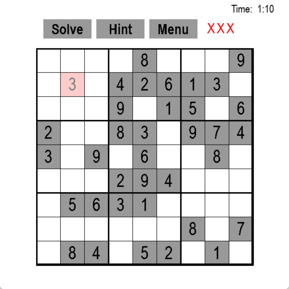 I'm proud to present to you one of my favorite puzzle games, Sudoku, made entirely in Python! This program has quite a few neat features in it, including semi-randomized boards, a difficulty select, a timer, a built-in answer check, a hint system, and even a way to let an AI solve the puzzle itself if you get stuck but still want to see the solution.