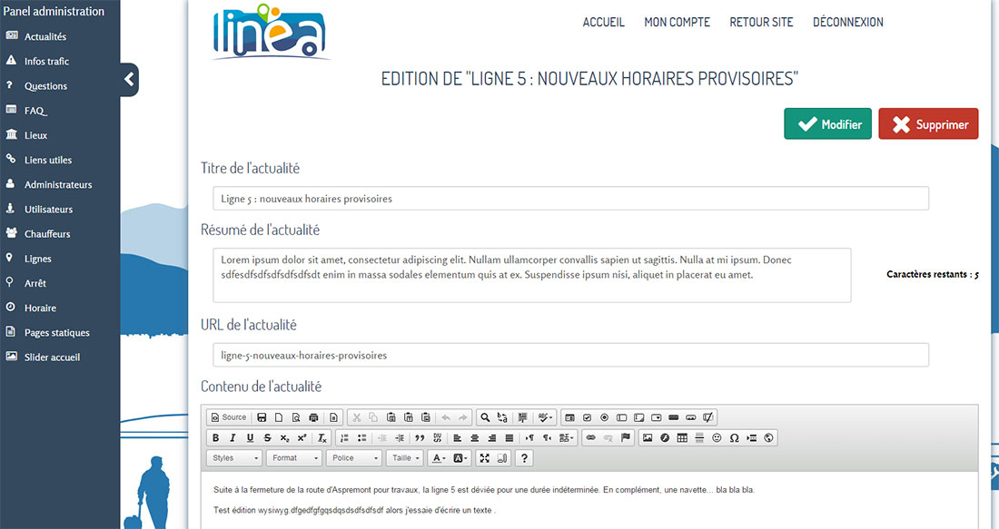 Projet tutoré réalisé pour les bus de la ville de Gap: Linéa Site conçu lors de ma Licence ATC MIW. Il a été développé grâce à : Laravel API GoogleMaps Voici quelques screens de l'application :
