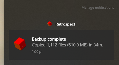 Another toast notification appears, and it describes the quantity and size of the files that were backed up, as well as how long it took.
