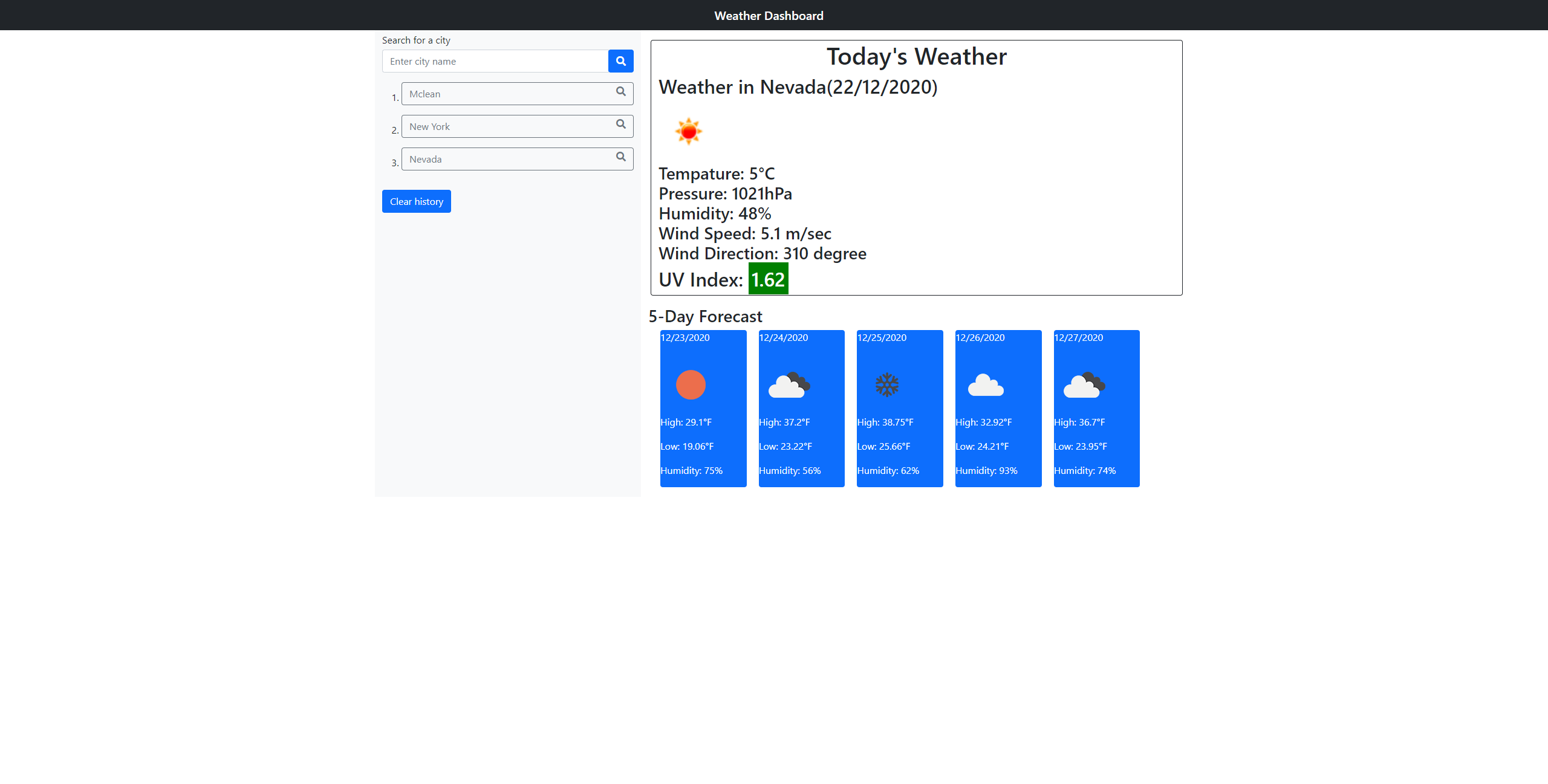 - When user clicks search the info for that current weather is shown to the right, and the weather for the next five days is shown underneath.