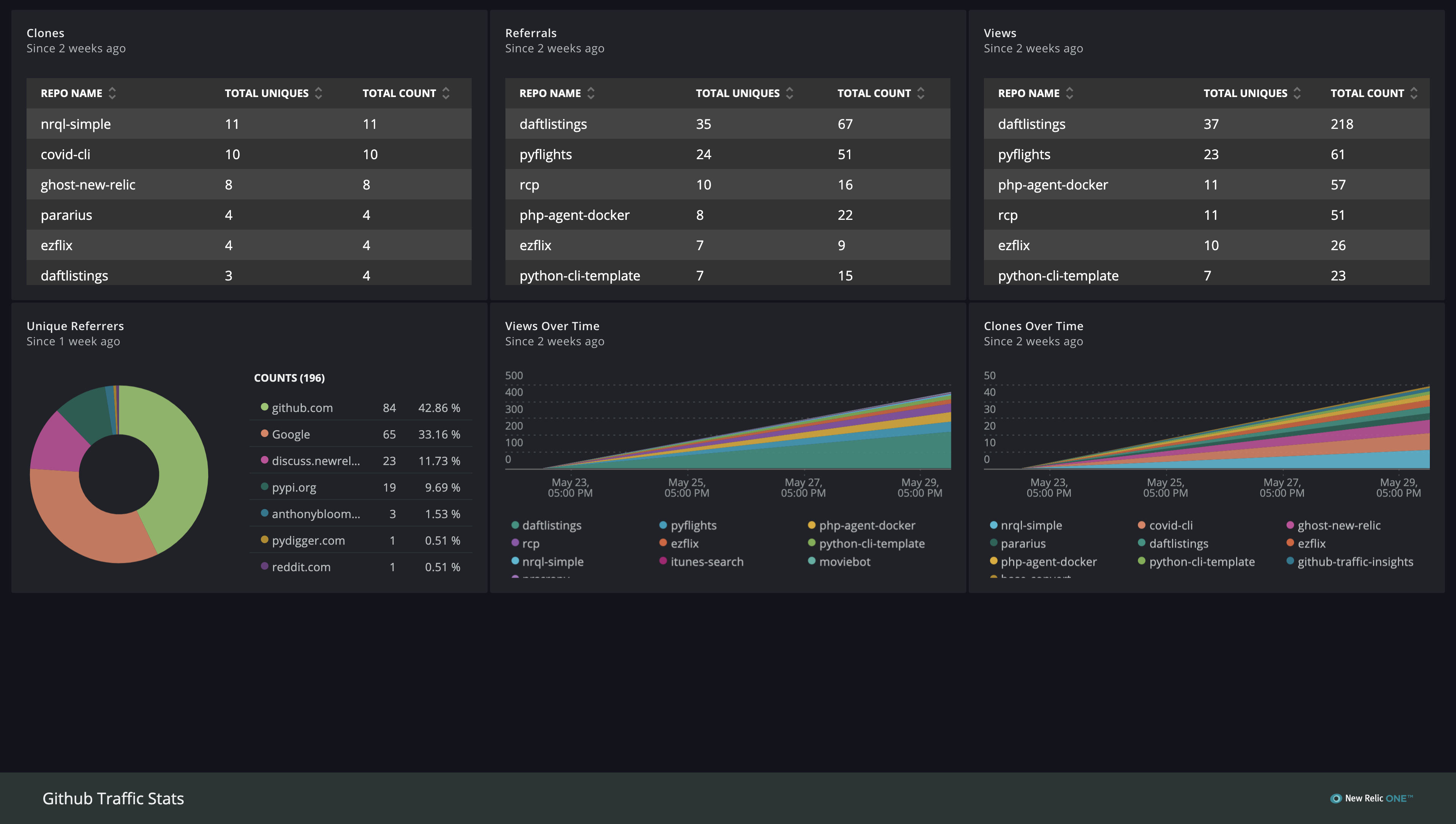 This information includes referral sources, referral paths, views and clones. The API returns data over the past 14 day period. As the API only returns data over the past 14 day period, this solution aims to give users access to historical Traffic data for their Github repositories within Insights. This Lambda function calls each endpoint every 15 days and creates custom events that you can then query and create visualations within New Relic Insights.