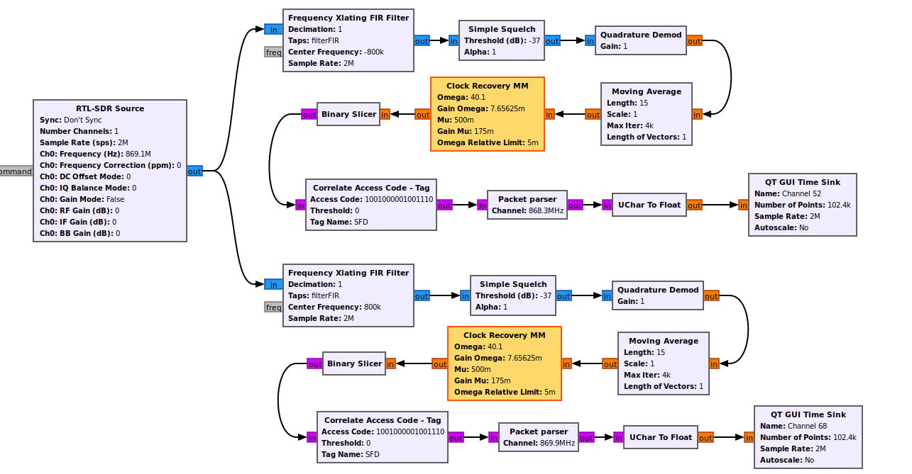 Presented in this repository flowgraph is an implementation of 6TiSCH protocol data sniffer. Packets in this flowgraph are captured and saved into the SQLite database. This flowgraph consists of only two channels but can be easily expanded to multiple more channels.