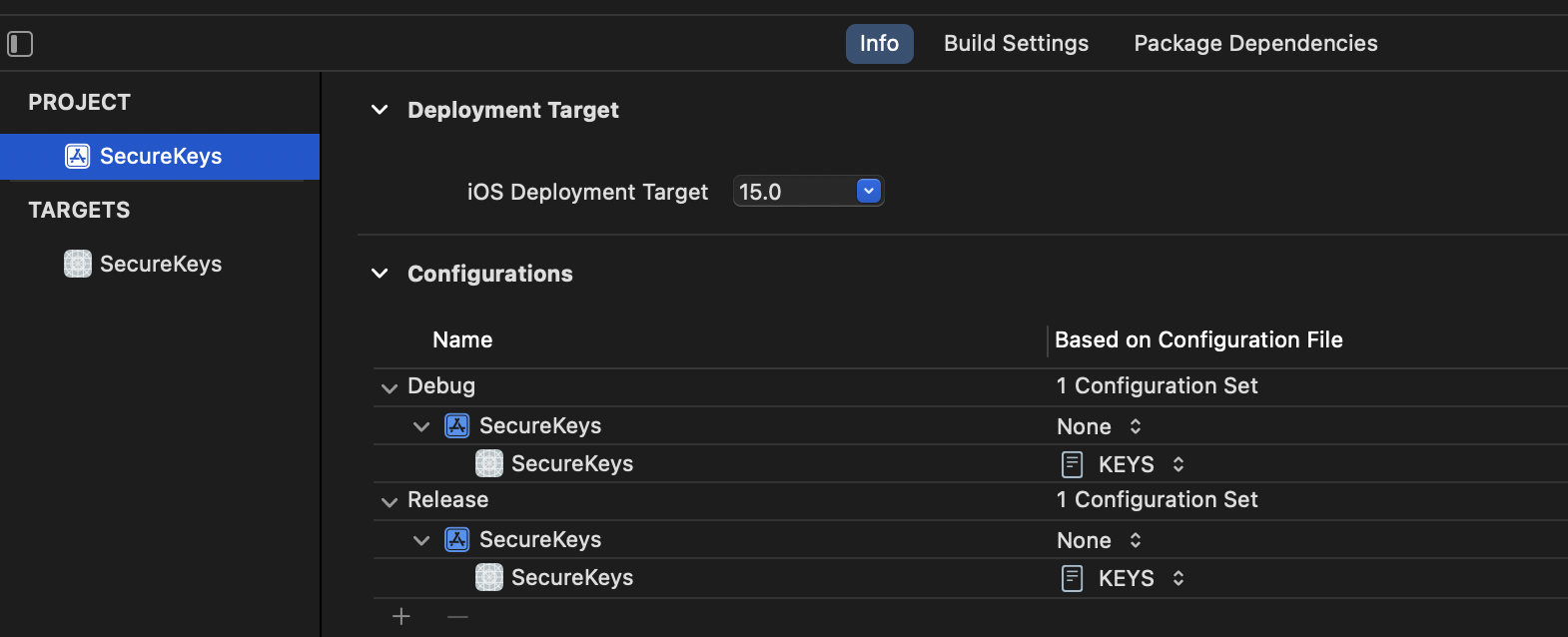 1- Add new configuration file (KEYS.xcconfig) and add keys in it