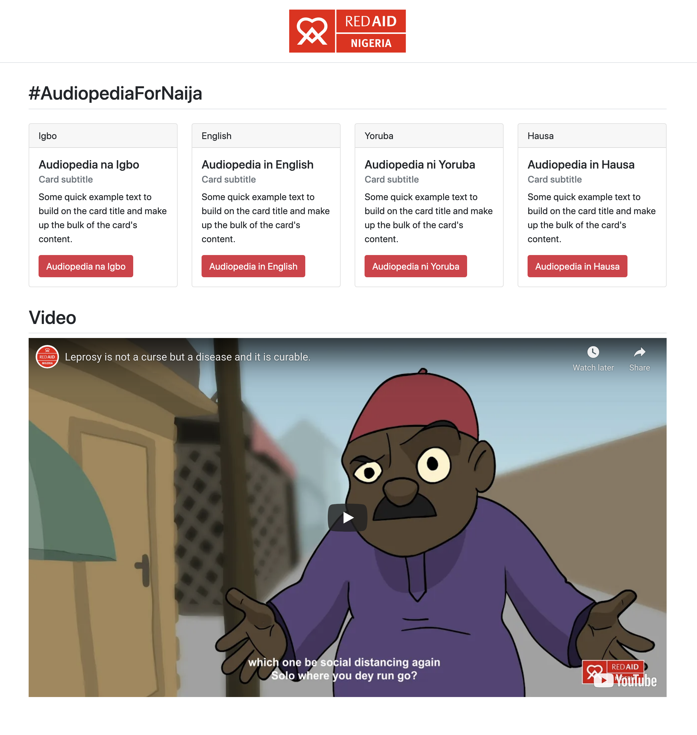 A simple mobile web user interface based on Bootstrap to create a single-page website for local NGOs or CBOs. This example was created for Red Aid Nigeria to provide simple access to Audiopedia contents.