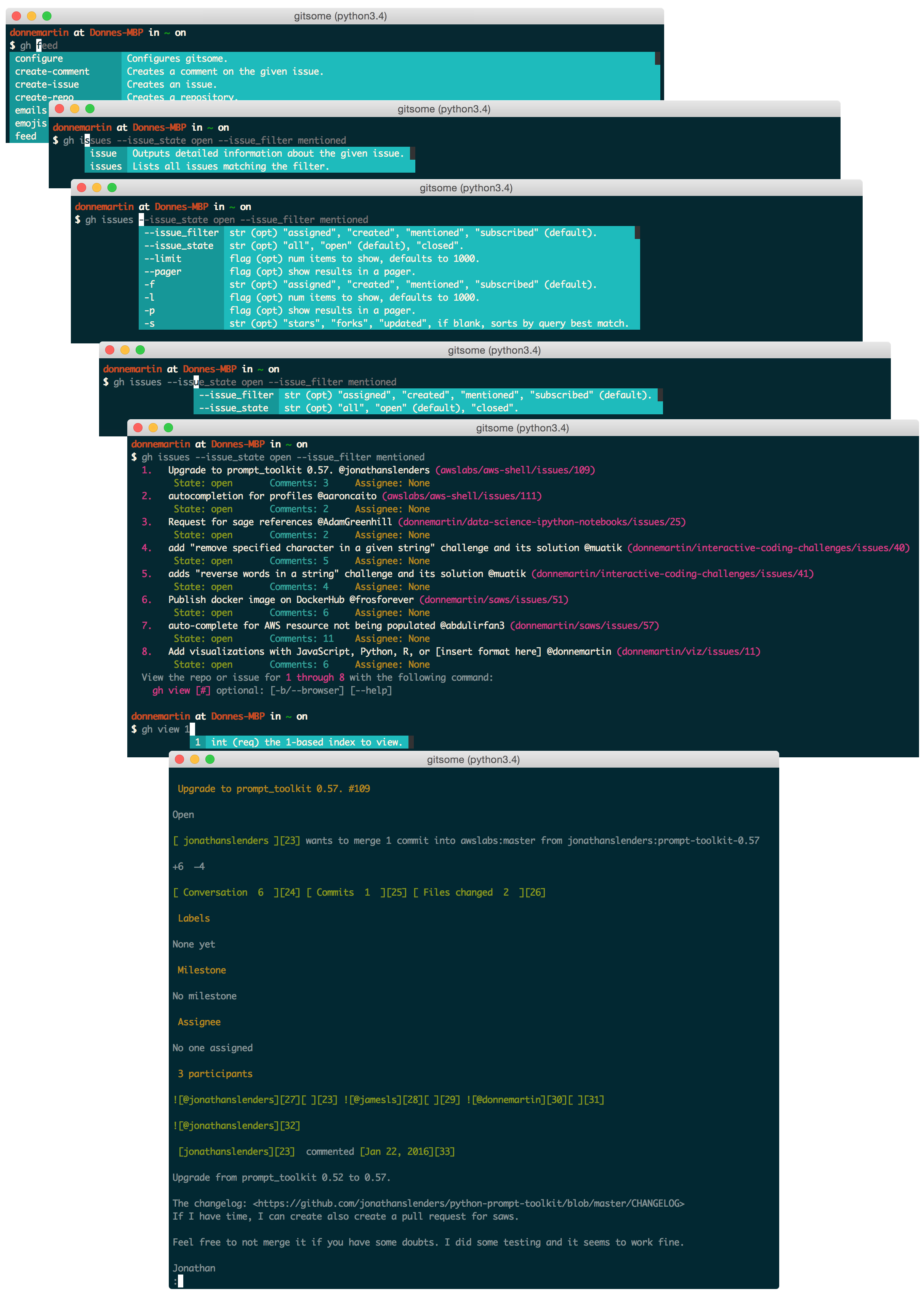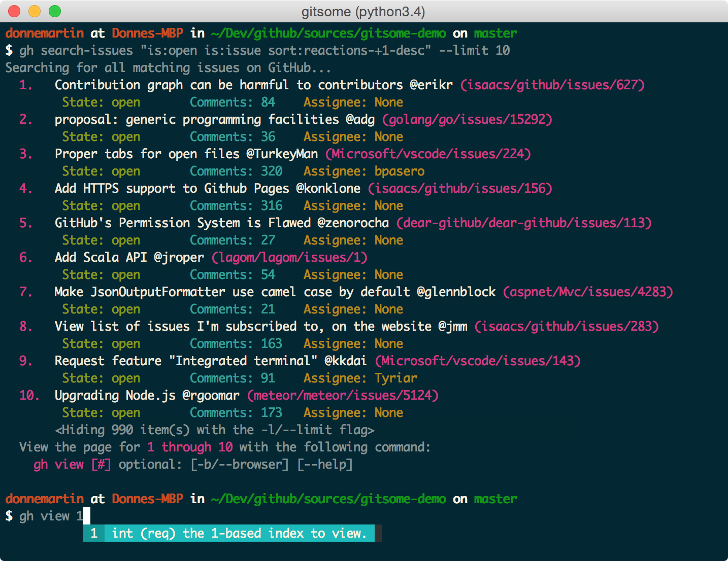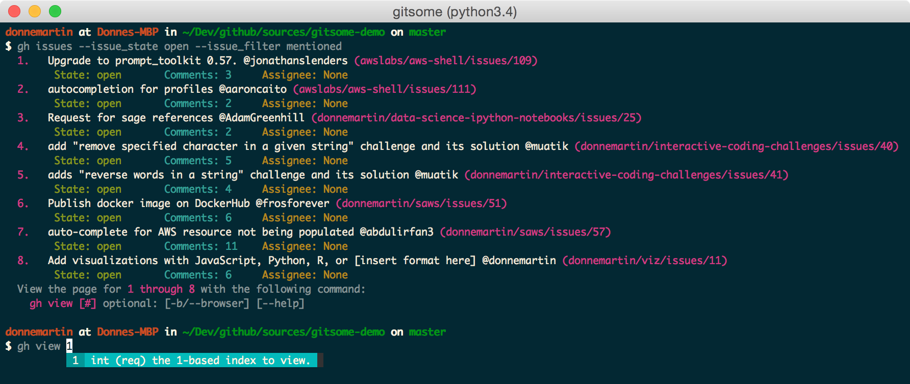 Once installed, run the optional gitsome autocompleter with interactive help: