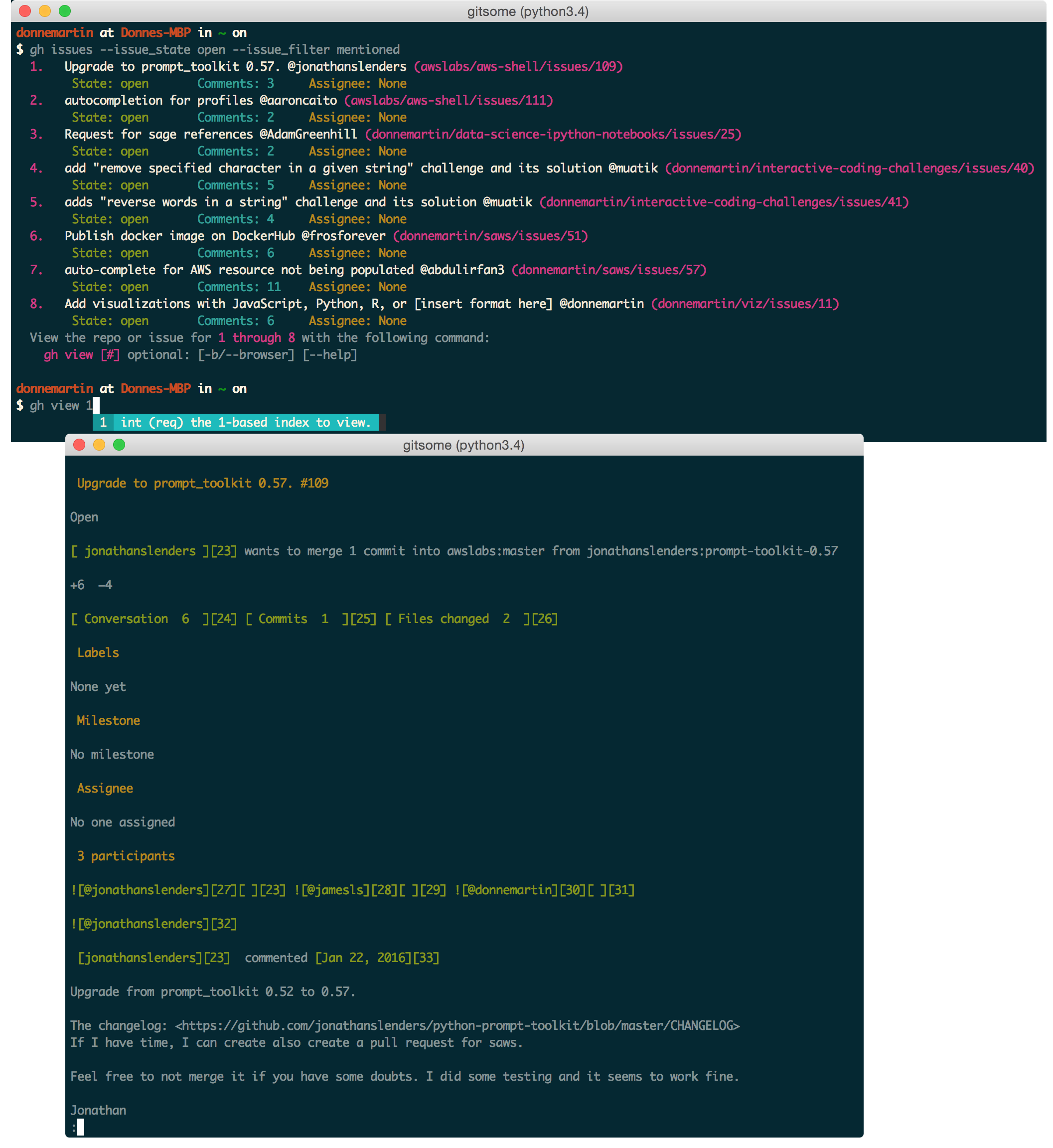 Note: Running the gitsome shell is not required to execute gh commands. After installing gitsome you can run gh commands from any shell.