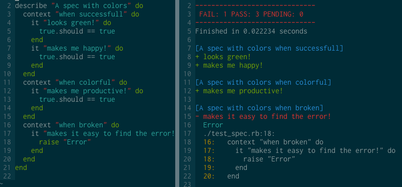 Beautiful, colorized RSpec tests in Vim with direct access to the line where the error occurred.
