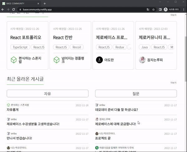 | 프로젝트 팀원 모집 및 댓글 기능 | 최근 게시글, 카테고리 별 게시글 조회 |