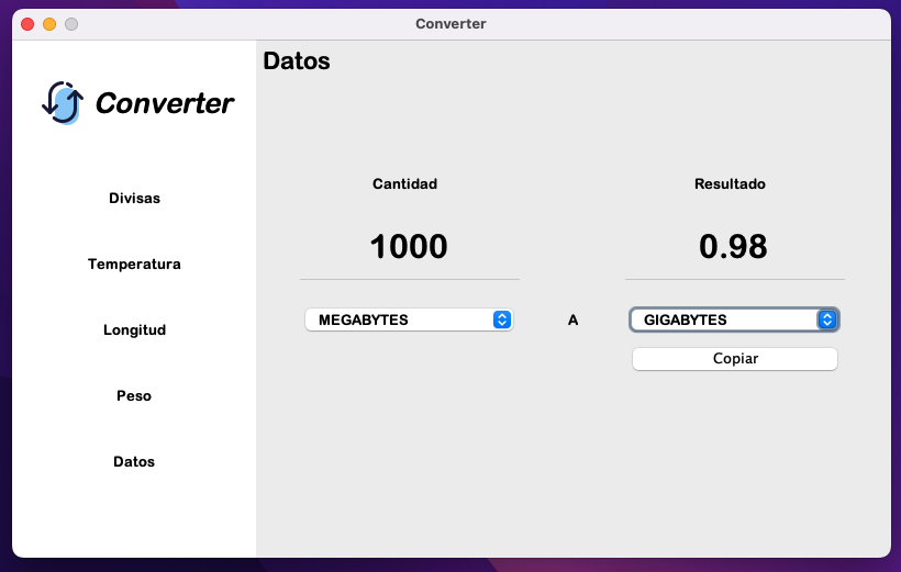 Converter es una aplicación de escritorio desarrollada en Java que utiliza la biblioteca Java Swing para proporcionar una interfaz de usuario amigable. La aplicación permite realizar conversiones de unidades de diferentes categorías, como longitud, temperatura, peso, etc.