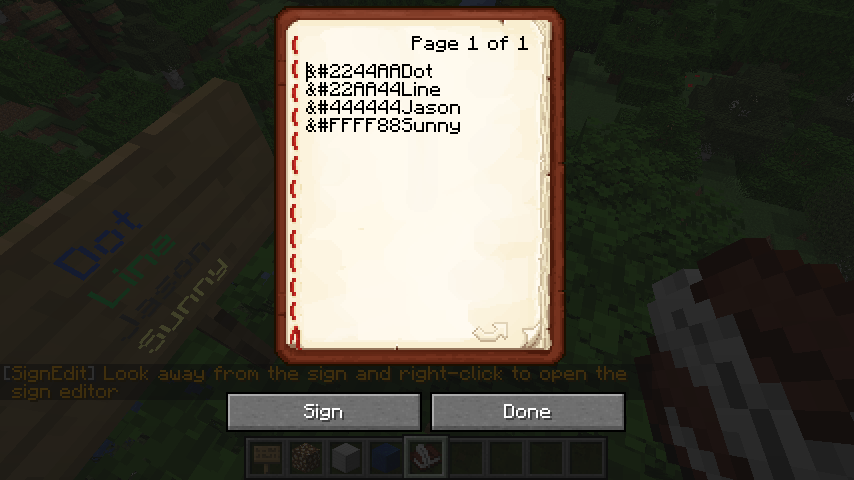- If the Bukkit server crashes or otherwise uncleanly unloads the plugin while the player is using this alternative sign editor GUI, the player will be given the book and quill, and the item originally in their hand will be destroyed.