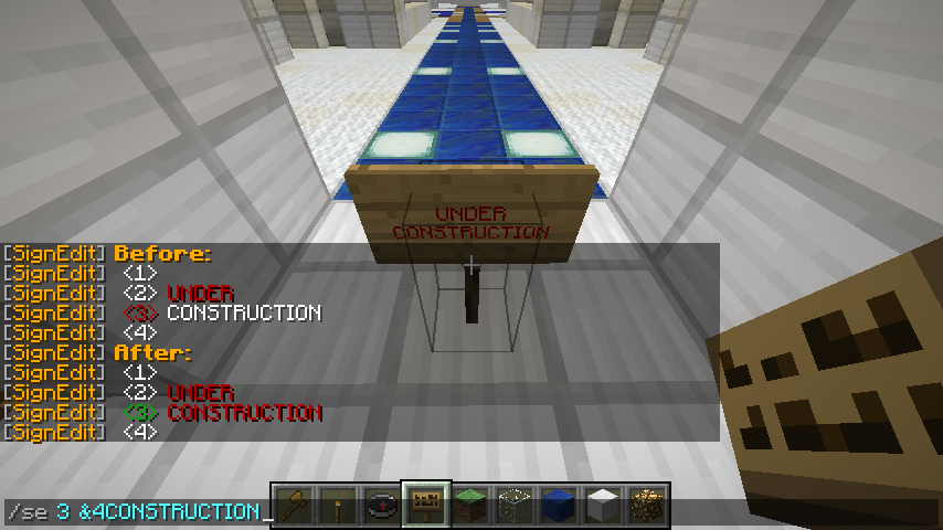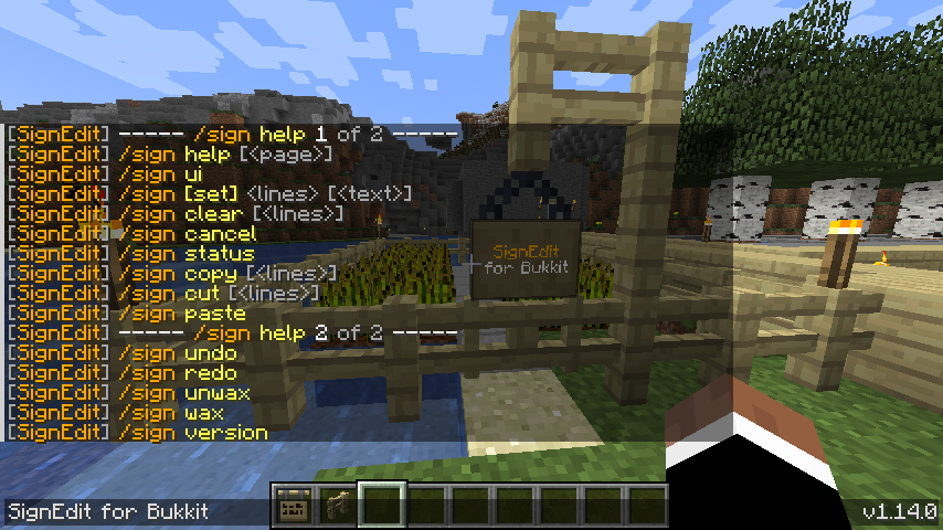 SignEdit for Bukkit is a Bukkit plugin that allows players to edit sign objects by looking at them or clicking on them and typing in a SignEdit command.