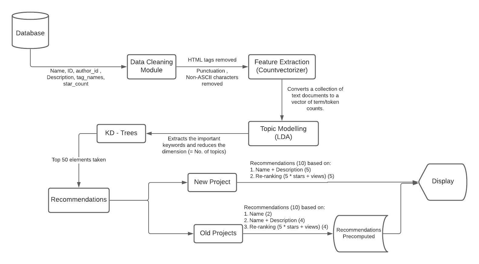 A SQL query was used to extract the id, author_id, name, description, tag_names, views, and star count which were stored as a JSON file (1,80,000 projects approx). We removed the following: