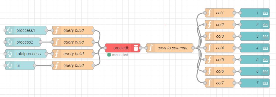 [{"id":"a251cec2.9317d","type":"tab","label":"플로우 1","disabled":false,"info":""},{"id":"7aa22138.0ce08","type":"ui_button","z":"a251cec2.9317d","name":"","group":"8ae29b1e.cb8af8","order":6,"width":4,"height":1,"passthru":false,"label":"totalproccess","tooltip":"","color":"","bgcolor":"","icon":"","payload":"1","payloadType":"str","topic":"button","x":170,"y":240,"wires":[["9f358e82.1fc78"]]},{"id":"b26f278.89769d8","type":"oracledb","z":"a251cec2.9317d","name":"","usequery":false,"query":"","usemappings":false,"mappings":"","server":"ebc8a121.d3cd6","resultaction":"single","resultlimit":100,"x":500,"y":220,"wires":[["7f30af84.60289"]]},{"id":"7f30af84.60289","type":"function","z":"a251cec2.9317d","name":"rows to columns","func":"var column = [];\nfor(var key in msg.payload[0]){\n\tcolumn.push(key);\n}\nvar val = [];\nfor(var i = 0; i<msg.payload.length;i++){\n\tval.push(Object.values(msg.payload[i]));\n}\n\nmsg.payload = [column, val];\nreturn msg;","outputs":1,"noerr":0,"initialize":"","finalize":"","x":660,"y":220,"wires":[["c4be1d21.1b1fd","44787c00.a8b0d4","e4dcf8c8.50dfc8","757bd1ac.488a1","bcc44a34.65ea18","953dd407.48f4a8","651bfa46.d15ce4"]]},{"id":"c4be1d21.1b1fd","type":"function","z":"a251cec2.9317d","name":"col1","func":"var col = msg.payload[0][0];\nvar val = msg.payload[1];\nvar result = col+'<br></br><br>'\nfor(var i =0; i<val.length;i++){\n result+=val[i][0]+'</br><br>';\n}\nmsg.payload = result;\nreturn msg;","outputs":1,"noerr":0,"initialize":"","finalize":"","x":830,"y":100,"wires":[["b8042c53.8e97c"]]},{"id":"44787c00.a8b0d4","type":"function","z":"a251cec2.9317d","name":"col2","func":"var col = msg.payload[0][1];\nvar val = msg.payload[1];\nvar len = msg.payload[0].length;\nvar result = col+'<br></br><br>'\nfor(var i =0; i<val.length;i++){\n result+=val[i][1]+'</br><br>';\n}\nmsg.payload = result;\nif(len>=2){\n\treturn msg;\n} else{\n return {payload : \"\"}\n}","outputs":1,"noerr":0,"initialize":"","finalize":"","x":830,"y":140,"wires":[["1ed84ba8.30c944"]]},{"id":"e4dcf8c8.50dfc8","type":"function","z":"a251cec2.9317d","name":"col3","func":"var col = msg.payload[0][2];\nvar val = msg.payload[1];\nvar len = msg.payload[0].length;\nvar result = col+'<br></br><br>'\nfor(var i =0; i<val.length;i++){\n result+=val[i][2]+'</br><br>';\n}\nmsg.payload = result;\nif(len>=3){\n\treturn msg;\n} else{\n return {payload : \"\"}\n}","outputs":1,"noerr":0,"initialize":"","finalize":"","x":830,"y":180,"wires":[["7efac7b0.ceeb88"]]},{"id":"757bd1ac.488a1","type":"function","z":"a251cec2.9317d","name":"col4","func":"var col = msg.payload[0][3];\nvar val = msg.payload[1];\nvar len = msg.payload[0].length;\nfunction dts(format){\n var year = format.getFullYear();\n var month = format.getMonth() + 1;\n if(month<10) month = '0' + month;\n var date = format.getDate();\n if(date<10) date = '0' + date;\n var hour = format.getHours();\n if(hour<10) hour = '0' + hour;\n var min = format.getMinutes();\n if(min<10) min = '0' + min;\n var sec = format.getSeconds();\n if(sec<10) sec = '0' + sec;\n return year + \"-\" + month + \"-\" + date + \" \" + hour + \":\" + min + \":\" + sec;\n}\nvar result = col+'<br></br><br>'\nfor(var i =0; i<val.length;i++){\n if(col=='TIME'){\n result+=dts(val[i][3])+'</br><br>';\n } else{\n result+=val[i][3]+'</br><br>';\n }\n \n}\nmsg.payload = result;\nif(len>=4){\n\treturn msg;\n} else{\n return {payload : \"\"}\n}","outputs":1,"noerr":0,"initialize":"","finalize":"","x":830,"y":220,"wires":[["da41c174.ecb91"]]},{"id":"b8042c53.8e97c","type":"ui_text","z":"a251cec2.9317d","group":"8ae29b1e.cb8af8","order":10,"width":4,"height":11,"name":"1","label":"","format":"{{msg.payload}}","layout":"col-center","x":950,"y":100,"wires":[]},{"id":"1ed84ba8.30c944","type":"ui_text","z":"a251cec2.9317d","group":"8ae29b1e.cb8af8","order":11,"width":4,"height":11,"name":"2","label":"","format":"{{msg.payload}}","layout":"col-center","x":950,"y":140,"wires":[]},{"id":"7efac7b0.ceeb88","type":"ui_text","z":"a251cec2.9317d","group":"8ae29b1e.cb8af8","order":12,"width":4,"height":11,"name":"3","label":"","format":"{{msg.payload}}","layout":"col-center","x":950,"y":180,"wires":[]},{"id":"da41c174.ecb91","type":"ui_text","z":"a251cec2.9317d","group":"8ae29b1e.cb8af8","order":13,"width":4,"height":11,"name":"4","label":"","format":"{{msg.payload}}","layout":"col-center","x":950,"y":220,"wires":[]},{"id":"bcc44a34.65ea18","type":"function","z":"a251cec2.9317d","name":"col5","func":"var col = msg.payload[0][4];\nvar val = msg.payload[1];\nvar len = msg.payload[0].length;\nfunction dts(format){\n var year = format.getFullYear();\n var month = format.getMonth() + 1;\n if(month<10) month = '0' + month;\n var date = format.getDate();\n if(date<10) date = '0' + date;\n var hour = format.getHours();\n if(hour<10) hour = '0' + hour;\n var min = format.getMinutes();\n if(min<10) min = '0' + min;\n var sec = format.getSeconds();\n if(sec<10) sec = '0' + sec;\n return year + \"-\" + month + \"-\" + date + \" \" + hour + \":\" + min + \":\" + sec;\n}\nvar result = col+'<br></br><br>'\nfor(var i =0; i<val.length;i++){\n if(col=='TIME'){\n result+=dts(val[i][4])+'</br><br>';\n } else{\n result+=val[i][4]+'</br><br>';\n }\n \n}\nmsg.payload = result;\nif(len>=5){\n\treturn msg;\n} else{\n return {payload : \"\"}\n}","outputs":1,"noerr":0,"initialize":"","finalize":"","x":830,"y":260,"wires":[["2a96cc57.977894"]]},{"id":"2a96cc57.977894","type":"ui_text","z":"a251cec2.9317d","group":"8ae29b1e.cb8af8","order":14,"width":4,"height":11,"name":"5","label":"","format":"{{msg.payload}}","layout":"col-center","x":950,"y":260,"wires":[]},{"id":"953dd407.48f4a8","type":"function","z":"a251cec2.9317d","name":"col6","func":"var col = msg.payload[0][5];\nvar val = msg.payload[1];\nvar len = msg.payload[0].length;\nfunction dts(format){\n var year = format.getFullYear();\n var month = format.getMonth() + 1;\n if(month<10) month = '0' + month;\n var date = format.getDate();\n if(date<10) date = '0' + date;\n v