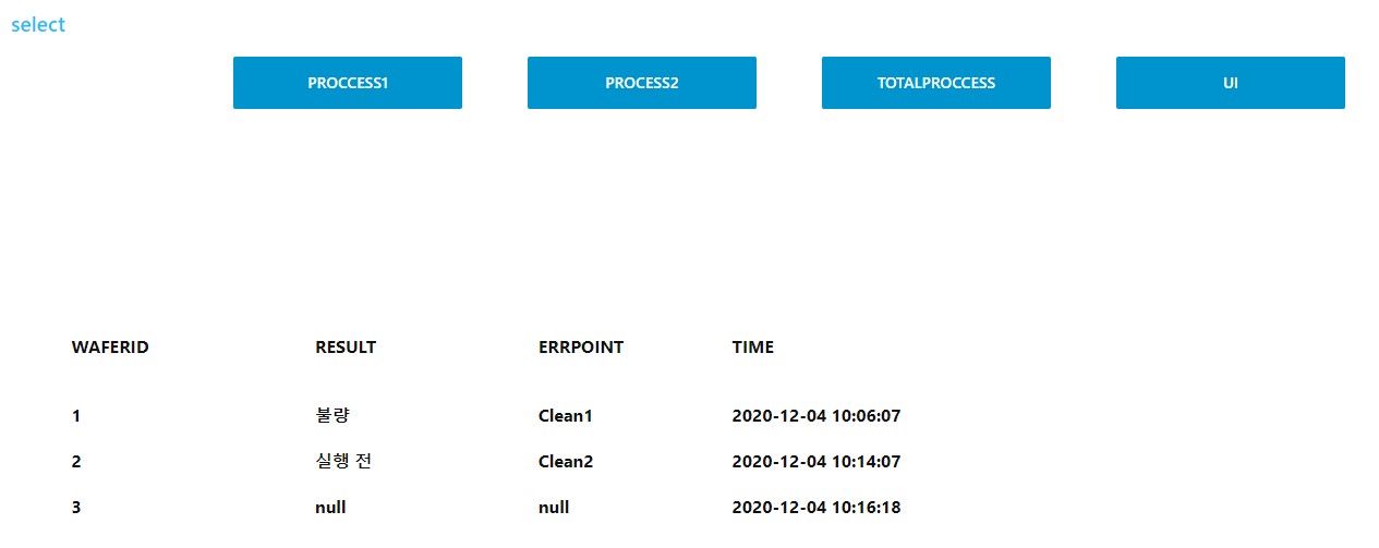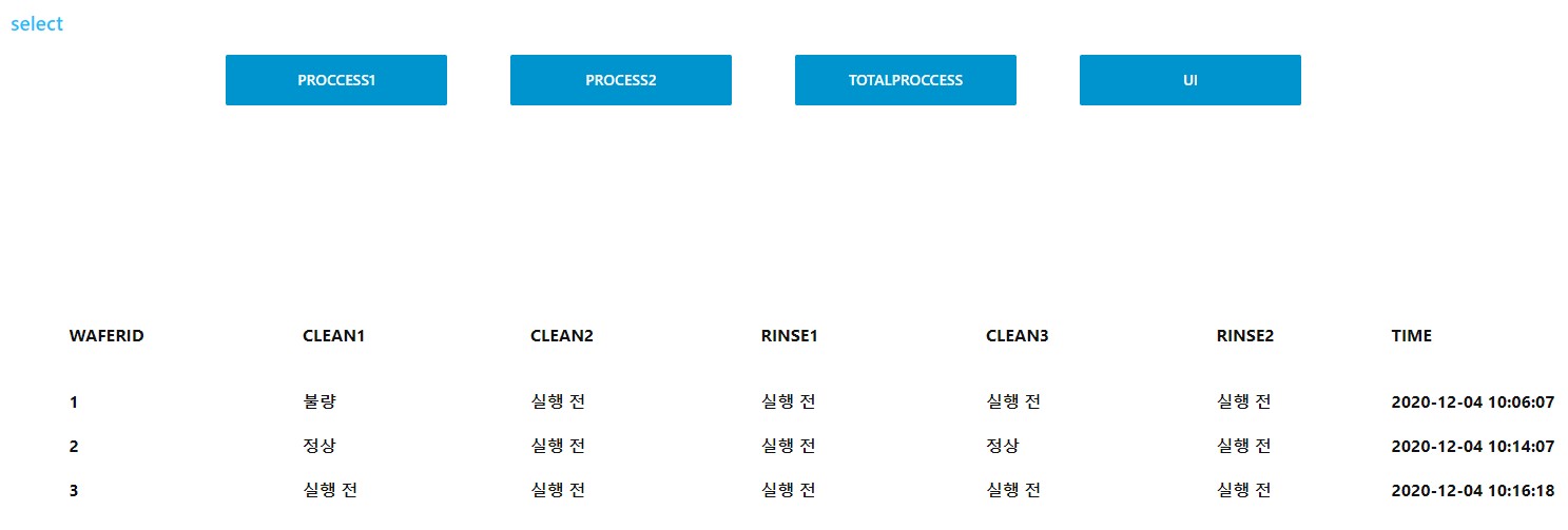 불순물 제거 및 건조 과정에서 중요한 parameter로써 여길 수 있는 것은 각 과정 진행 시간 및 온도, 습도 등이 있습니다. 이번 프로젝트에서는 이 중 시간에 집중하여 적정 공정 시간을 13분 이상 20분 미만으로 가정했습니다. 기준에 미달한 wafer는 불량품, 기준에 통과한 wafer는 정상, 아직 공정이 시작하지 않은 wafer는 실행전으로 표시되는 Totalprocess라는 table 및 각 wafer 별 현재 진행 상태 및 불량 발생 여부를 판단할 수 있는 UI table을 통해 Node-RED Dashboard로 표현하는 것을 목표로 했습니다.