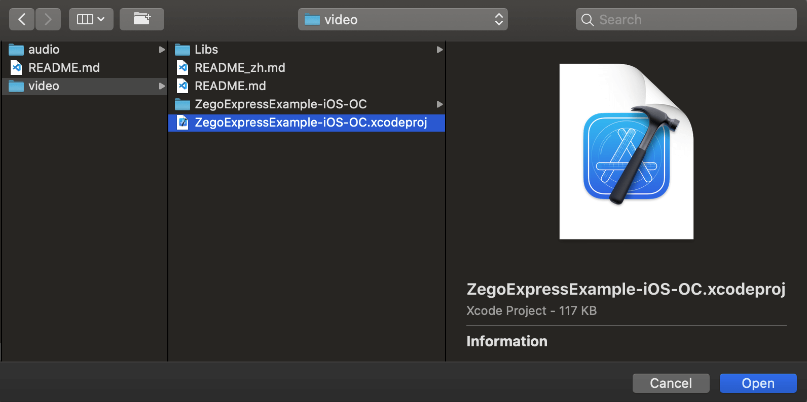 ZegoExpressExample.xcodeprojin the sample code folder downloaded and unzipped in the first step, and clickOpen. -