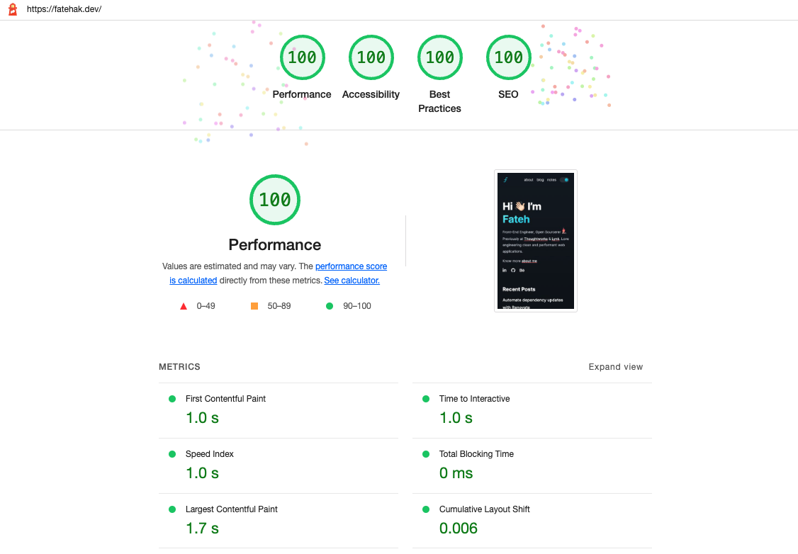 I wanted to verify if all the optimizations I've done so far actually worked, so I did a Lighthouse test for my site fazk.dev.