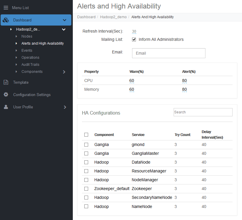 Alert configuration allows the user to configure alert & warning threshold levels for a cluster utilization in terms of CPU and Memory. This feature enables the user to configure thresholds level of alert & warning for CPU & Memory utilization applicable over all the nodes of the cluster on which it is configured.