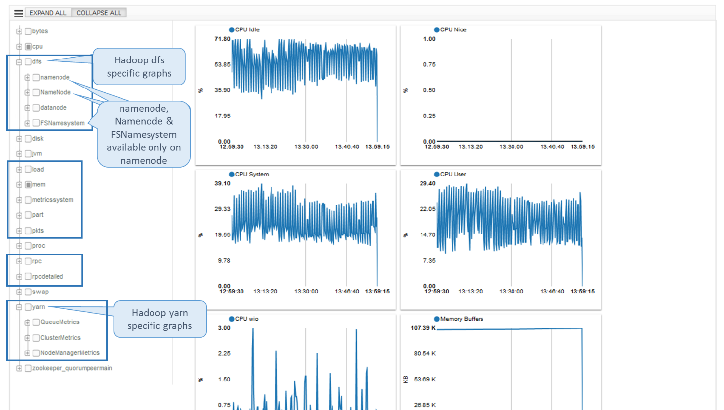 Node utilization graphs can be accessed through “UTILIZATION GRAPHS >” link on Node Details page. A screenshot of Hadoop 2 node utilization graph page is as shown below. The user can view the trend cumulatively for last one hour, or one day, or one week, or one month or one year. Accordingly the utilization graphs are drawn.