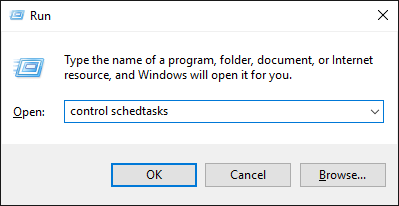 We want to check every X hours if the new subtitles are up yet. To do that, we use a feature in Windows called Task Scheduler to run SonarrScript.exe every X hours. So first, open Task Scheduler by pressing Windows Button + R to open the Run window. Enter the following text: control schedtasks and hit enter.