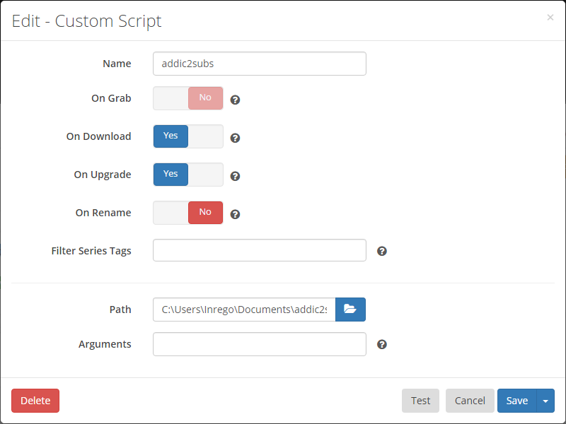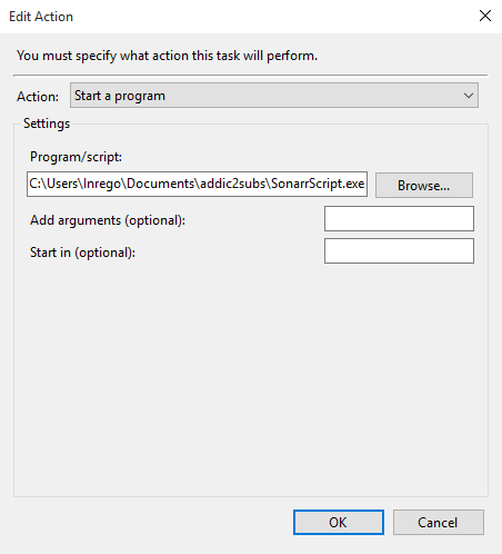 #Configuring Sonarr In Sonarr, go to Settings -> Connect Click the big plus (+) to add a new Connection. Give it a name (for example addic2subs), and set it to run On Download and On Upgrade (not On Grab or On Rename). In Path, you locate SonarrScript.exe Leave Arguments empty.