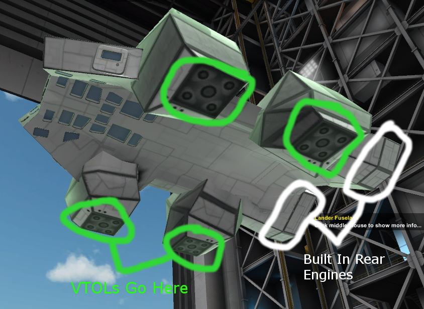 In order to do vertical take off and landing, attach Four VTOL egines to the bottom of the legs.