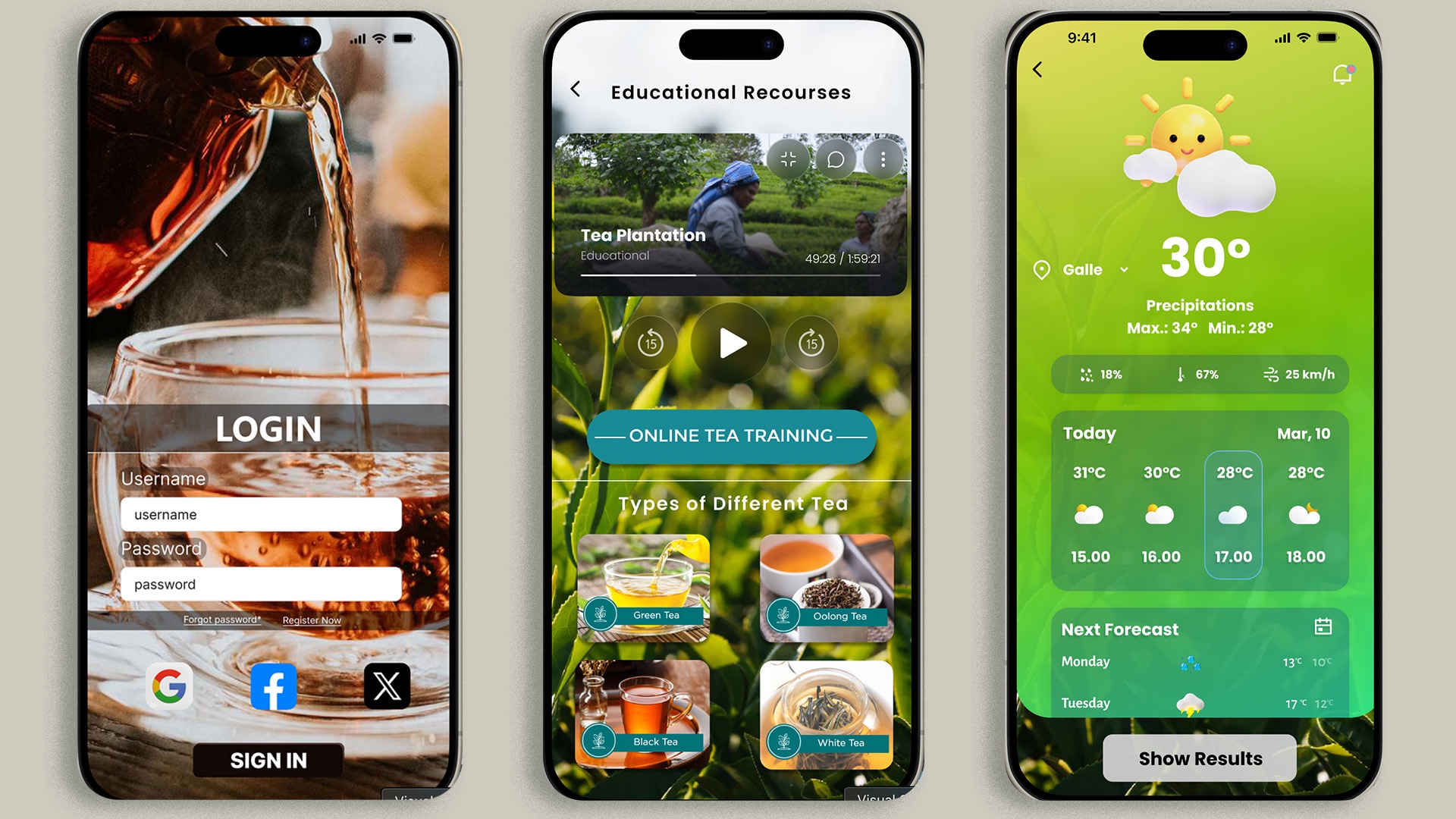 This repo contains the UI screens designed in Figma to support functionalities like weather forecasting, irrigation management, disease detection, tea education, and more.