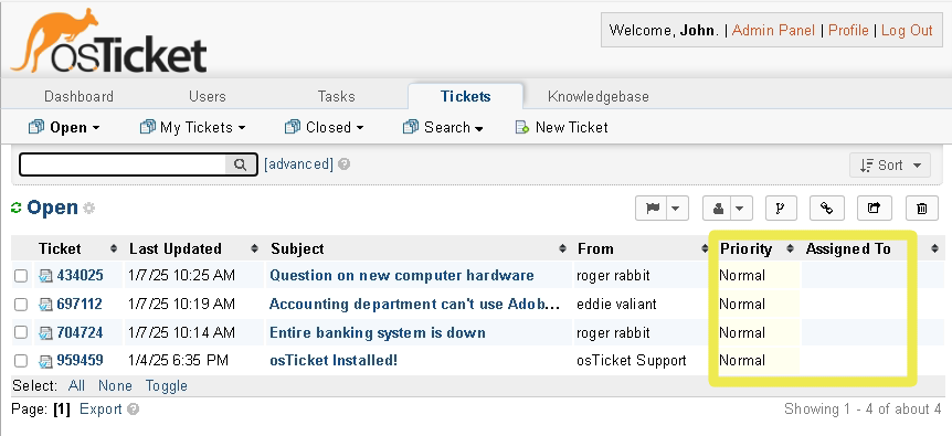 When an admin logs in they can see live tickets. Help Desk agents and Queue managers will be able to assign tickets to agents (including themselves) as well as assign the appropriate priority and SLAs.