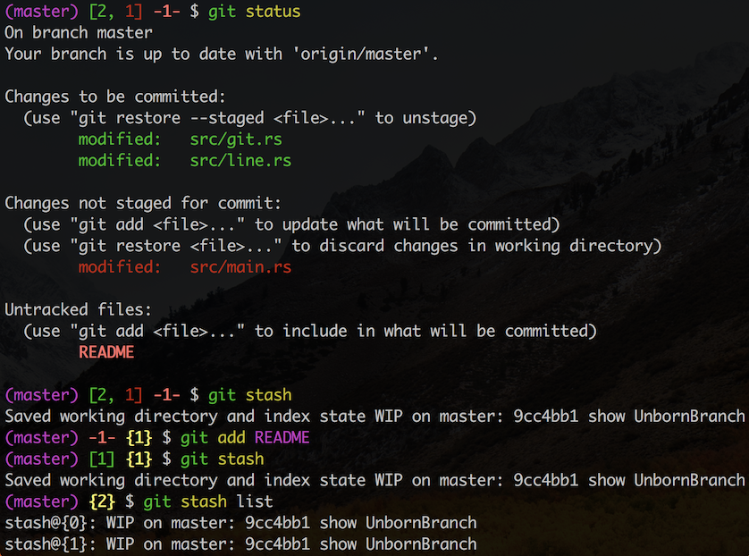 Simple git prompt for bash/zsh Git repository information inside a shell prompt. Installation cargo install --git https://github.com/Joker/git_prompt or make install zsh ~/.zshrc setopt PROMPT_SUBST PROMPT=$'%n@%m %2~ \$(git_prompt zsh) $ ' bash ~/.bashrc PS1='\u@\h \W $(git_prompt) \$ '
