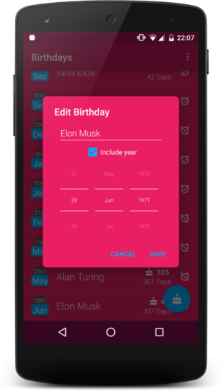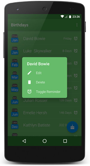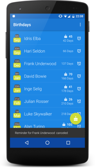 Birthday reminder is a simple Material Design Android app which notifies users of upcoming birthdays. Released in 2015, it has had many design and feature update since then, many coming from user requests. Recent additions include Firebase auth and realtime database for data backup. As I built this when I was quite inexperienced, it doesn't follow any of the common Android architecture patterns, so I wouldn't recommend using this structure elsewhere.