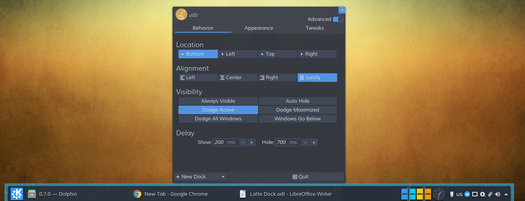 Latte is a dock based on plasma frameworks that provides an elegant and intuitive experience for your tasks and plasmoids. It animates its contents by using parabolic zoom effect and tries to be there only when it is needed.