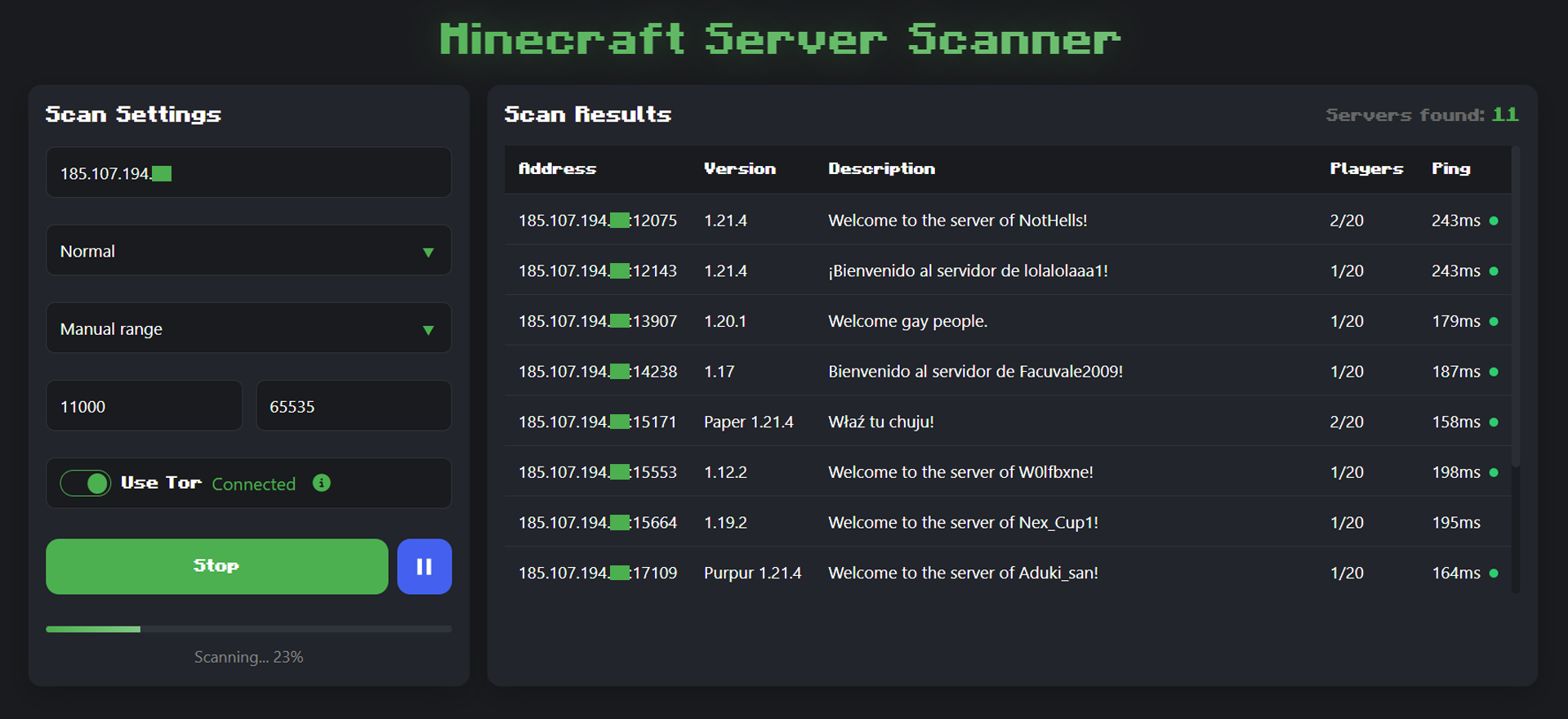 A web-based tool for scanning and discovering Minecraft servers with Tor support. This scanner allows you to find Minecraft servers across specified IP addresses and port ranges while maintaining anonymity through Tor network.