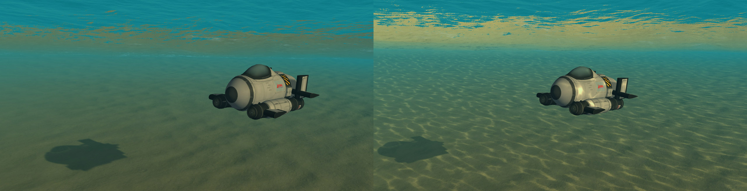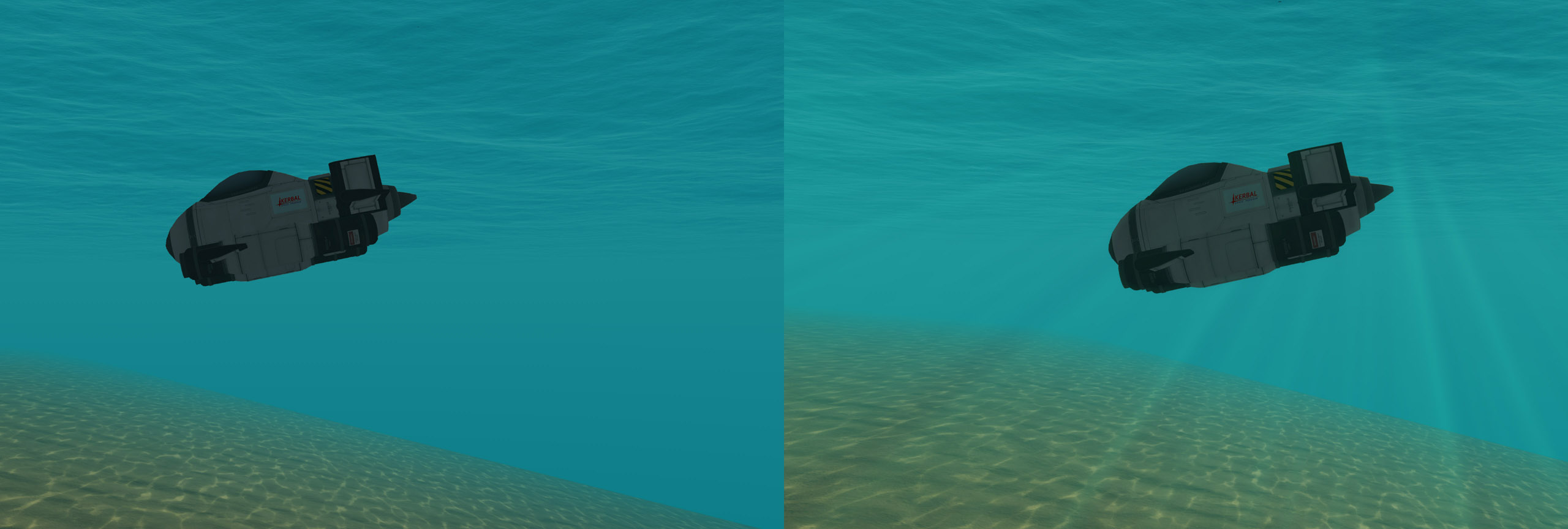 Volumetric underwater light rays, derived directly from the caustics textures and config. Brightness of underwater light rays can be adjusted. Light rays respect shadows.
