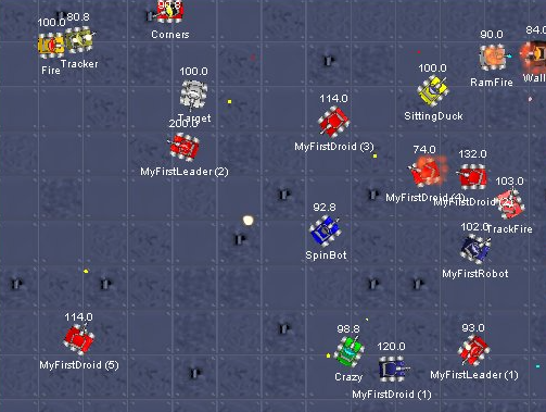 Find all robot positions and calculate a "force" based on distance to each robot, that gets projected into a steering direction in order to move away from all hostiles. Shoot the most priority Target based on distance and health.
