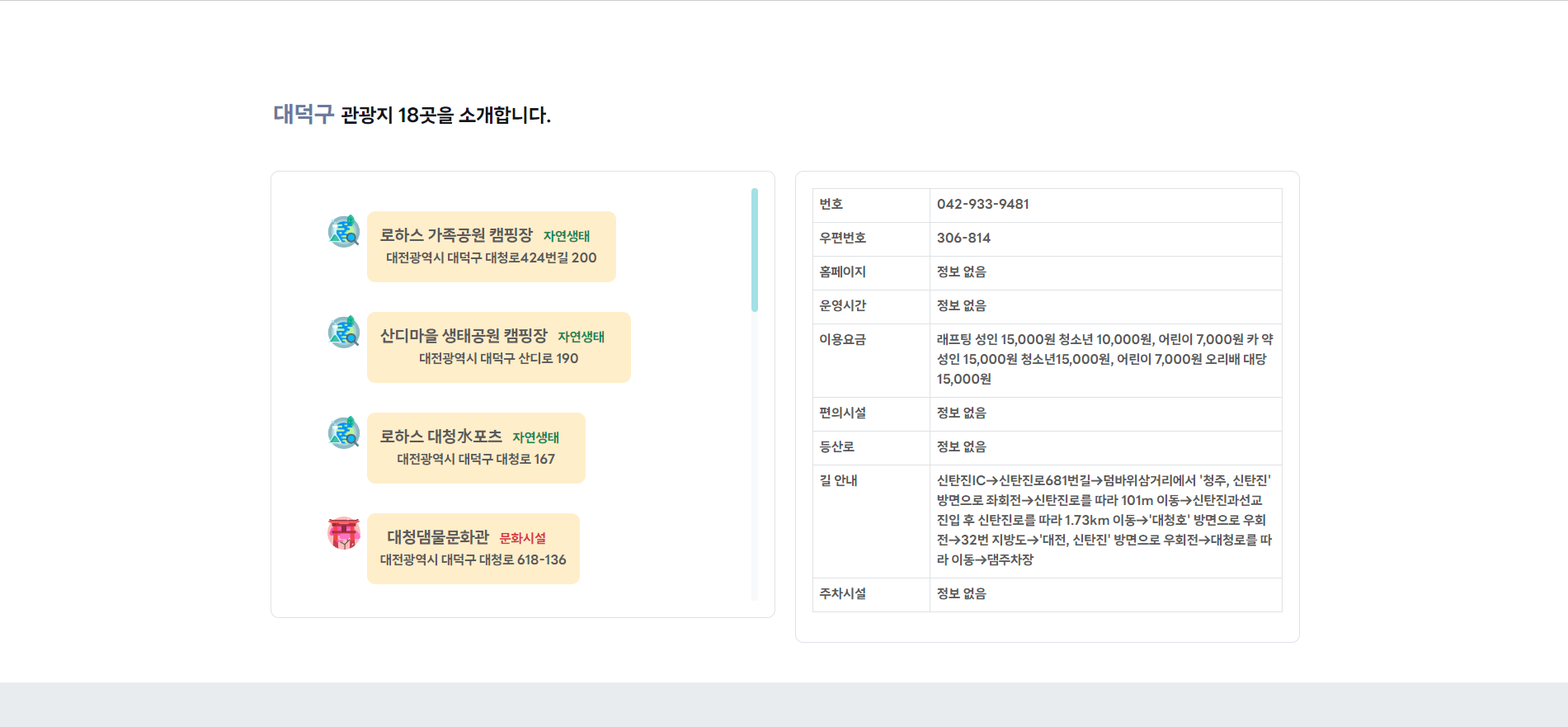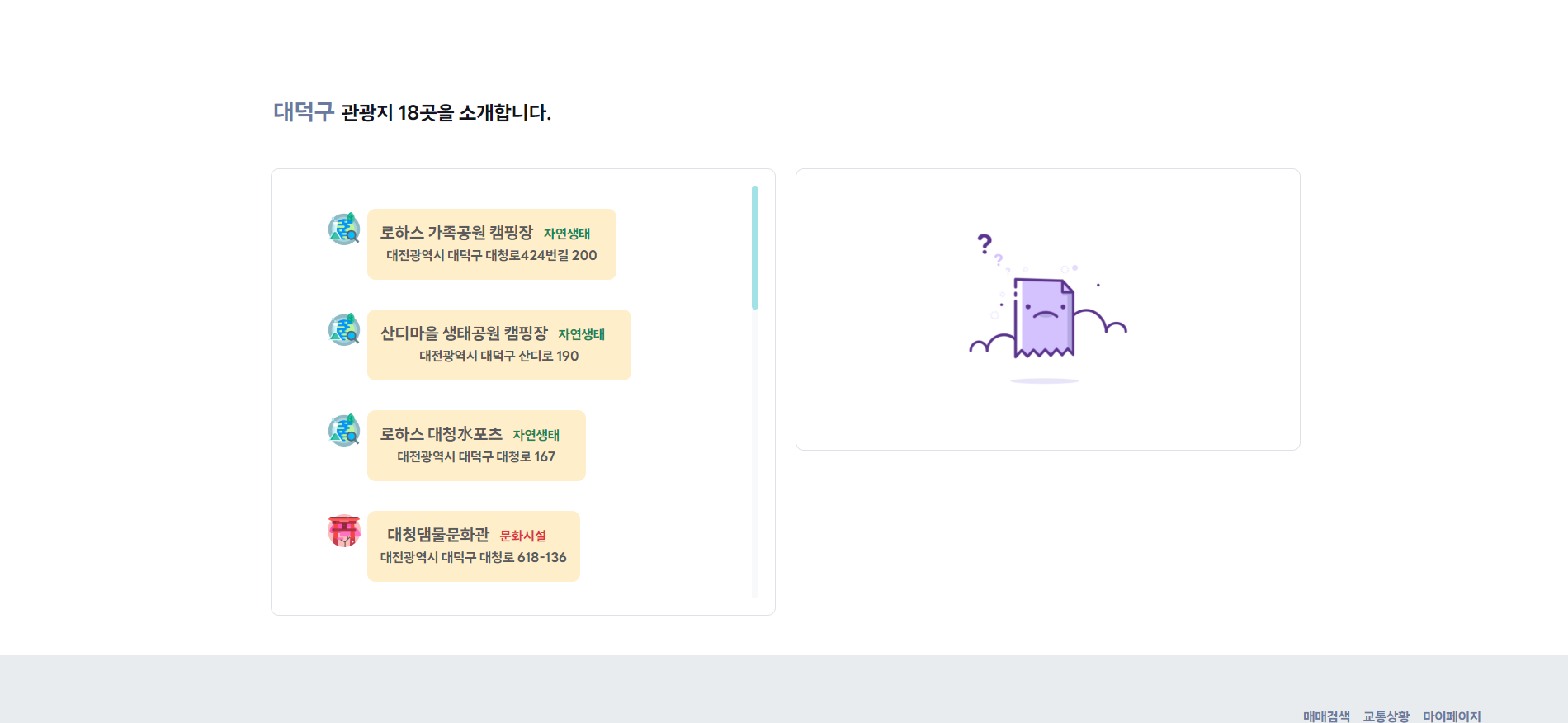 ์ค์ ์๋จ์ ๊ด๊ด์ง ๋ฒํผ์ ๋๋ฅด๋ฉด ํ์ฌ ํ์ด์ง์ ๋งค๋ฌผ ์์น ์ ๋ณด๋ฅผ ํ ๋๋ก ๋์ผํ ๊ตฌ๊ตฐ ์ง์ญ์ ๊ด๊ด์ง๋ฅผ ๋ฆฌ์คํธ ํํ๋ก ๋ณด์ฌ์ค๋ค. ๊ฐ ํญ๋ชฉ์ ํด๋ฆญํ๋ฉด ์ฐ์ธก ํ๋ฉด์์ ๊ด๋ จ ์์ธ ์ ๋ณด๋ฅผ ์กฐํํ ์ ์๋ค.
