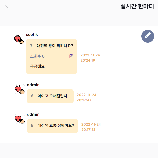 ๋๋๋งํฌ์ ๊ฒ์๊ธ ๋ฒํผ์ ํด๋ฆญํ๋ฉด ์ค๋ฅธ์ชฝ์ ์ฌ์ด๋๋ฐ์ ํจ๊ป ํด๋นํ๋ ์ง์ญ์ ๊ฒ์๊ธ ๋ชฉ๋ก์ ์ถ๋ ฅํ๋ค.