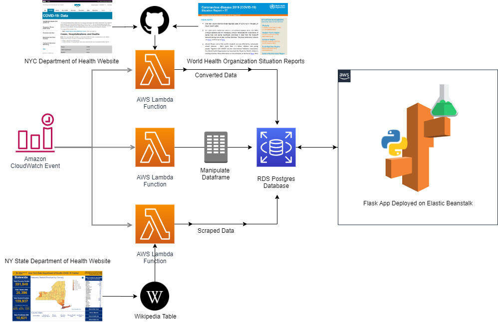 - AWS Lambda Functions pull up-to-date data from city, state and world to store into a relational database to update plotly graphs on the site.