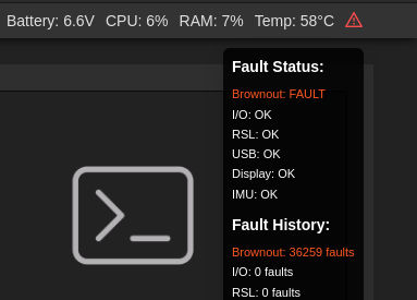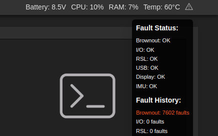 - Fault report publishing for brownouts, IO/I2C, USB, RSL, Display, and IMU.:
