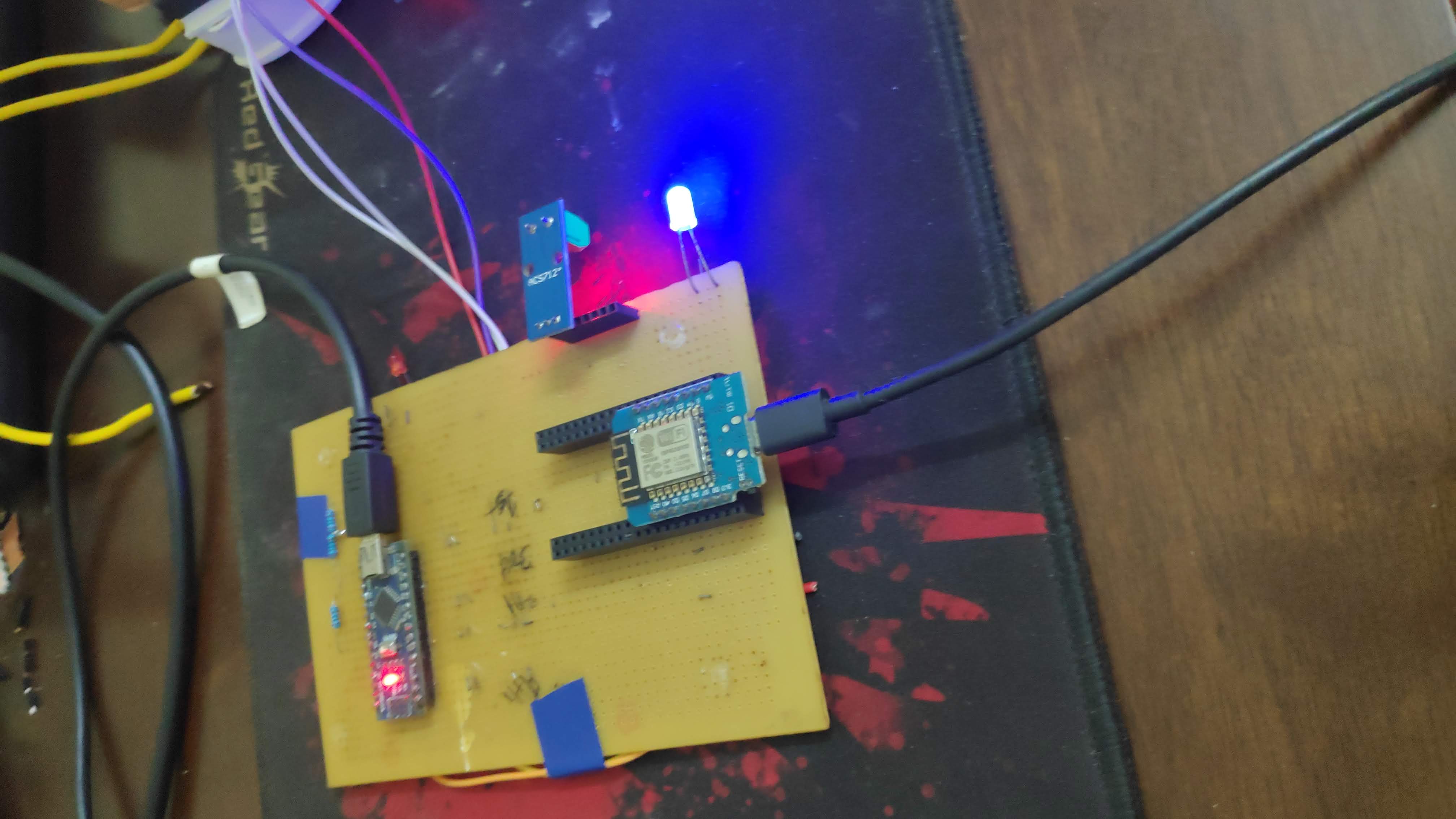 In our project, we are sending the data through the internet to our database, so that our website and the mobile app can access that data. Arduino as such does not have a WIFI chip inbuilt. So, we had to use a separate WIFI chip (ESP8266 node MCU) in serial communication with the Arduino board, to send the data to the database. Here, one could ask why didn’t we just connect the sensor to the node MCU. The problem was, node MCU provides 3.3V max as output voltage for peripherals but the sensor needed at least 5V DC as input for proper working. Therefore, we used two boards here, Arduino for reading and computing the sensor values, and node MCU for sending data to the database.