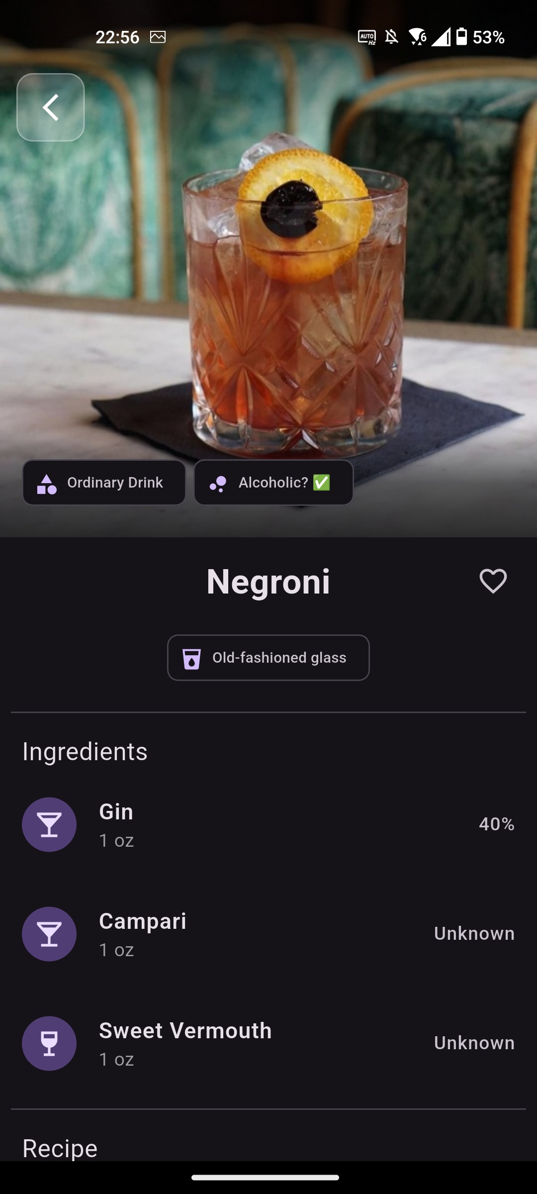 - Comprehensive Information: View ingredients, measurements, alcohol percentages, glass types, and categories