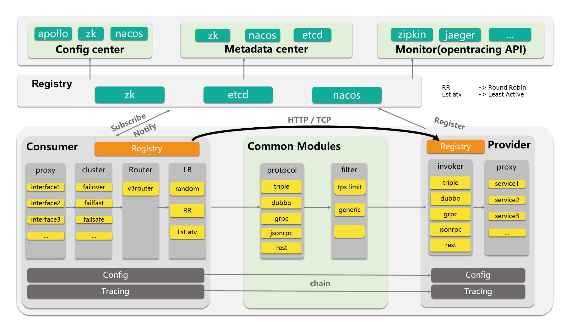 - Registry: ZooKeeper, etcd, Nacos, Consul, K8s