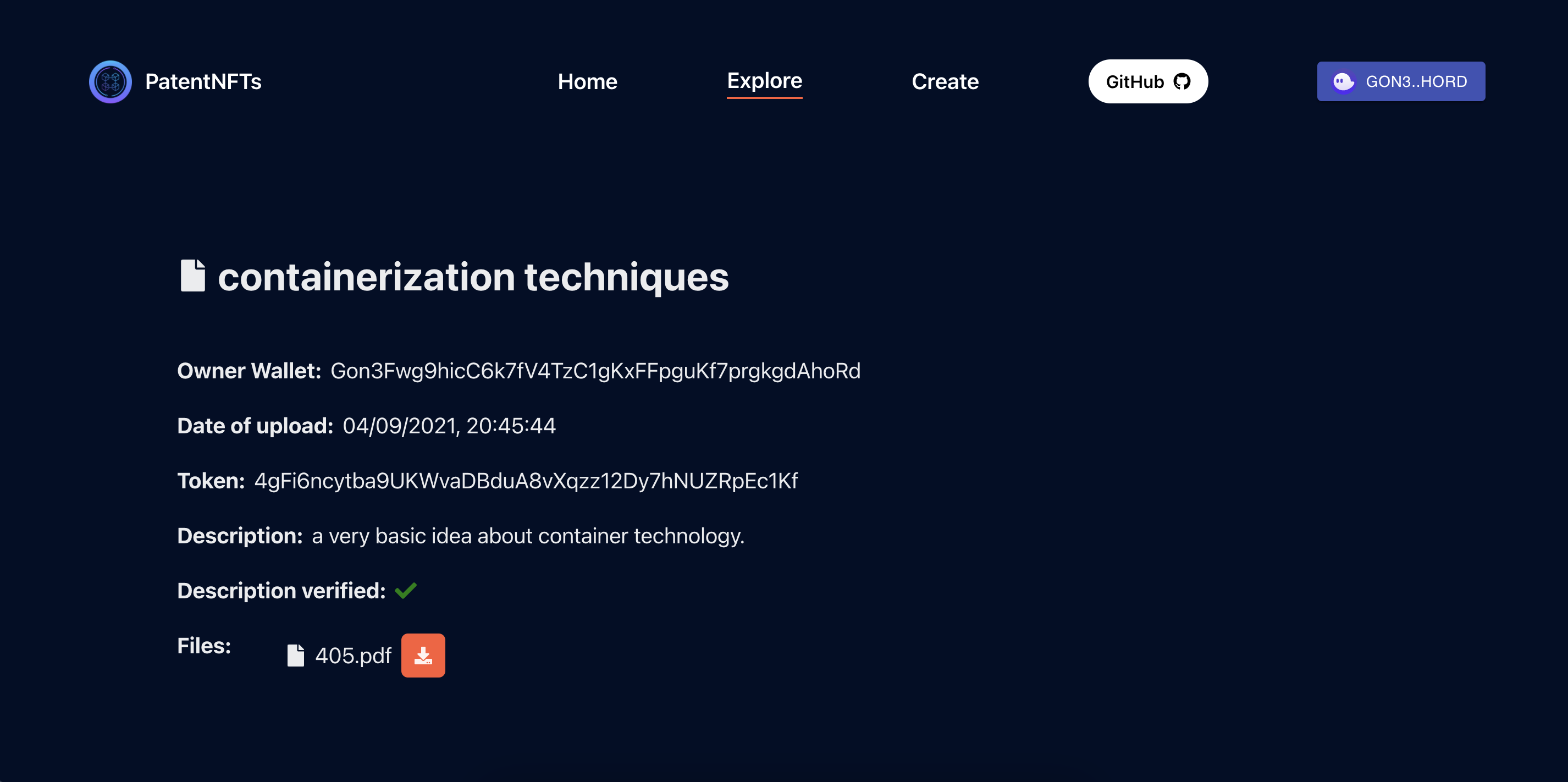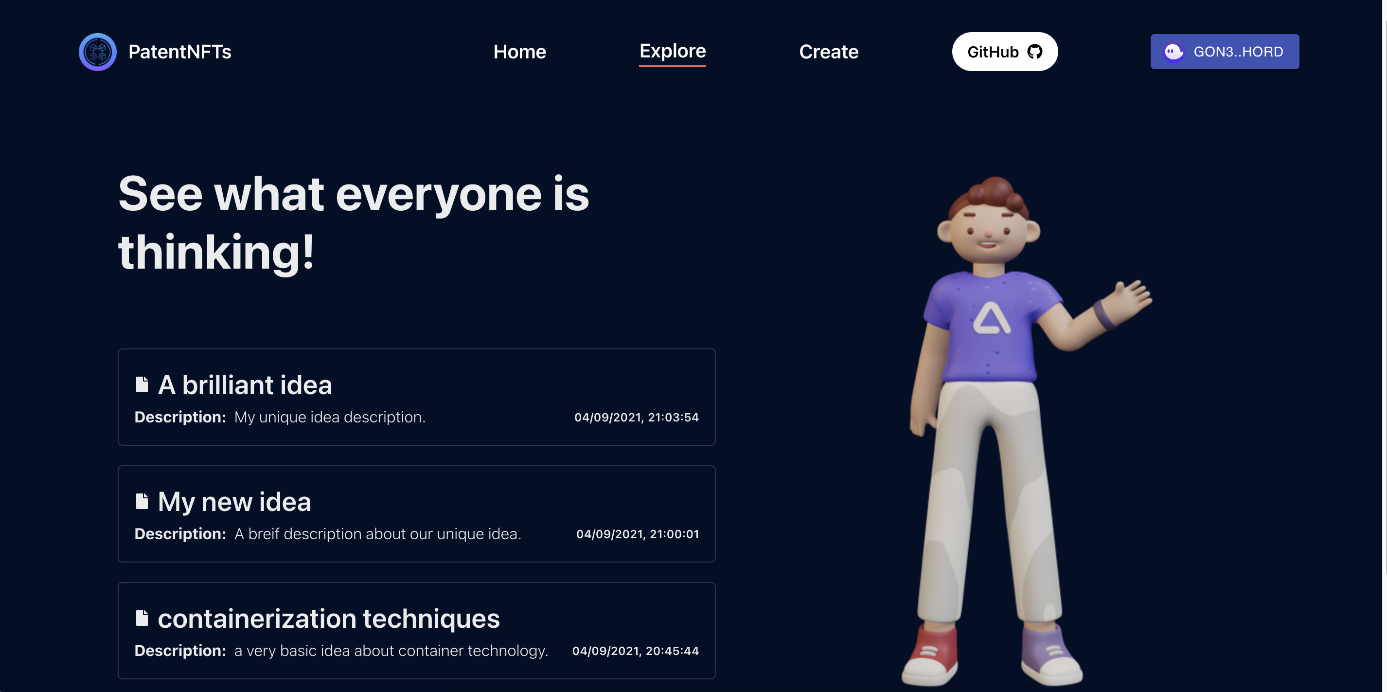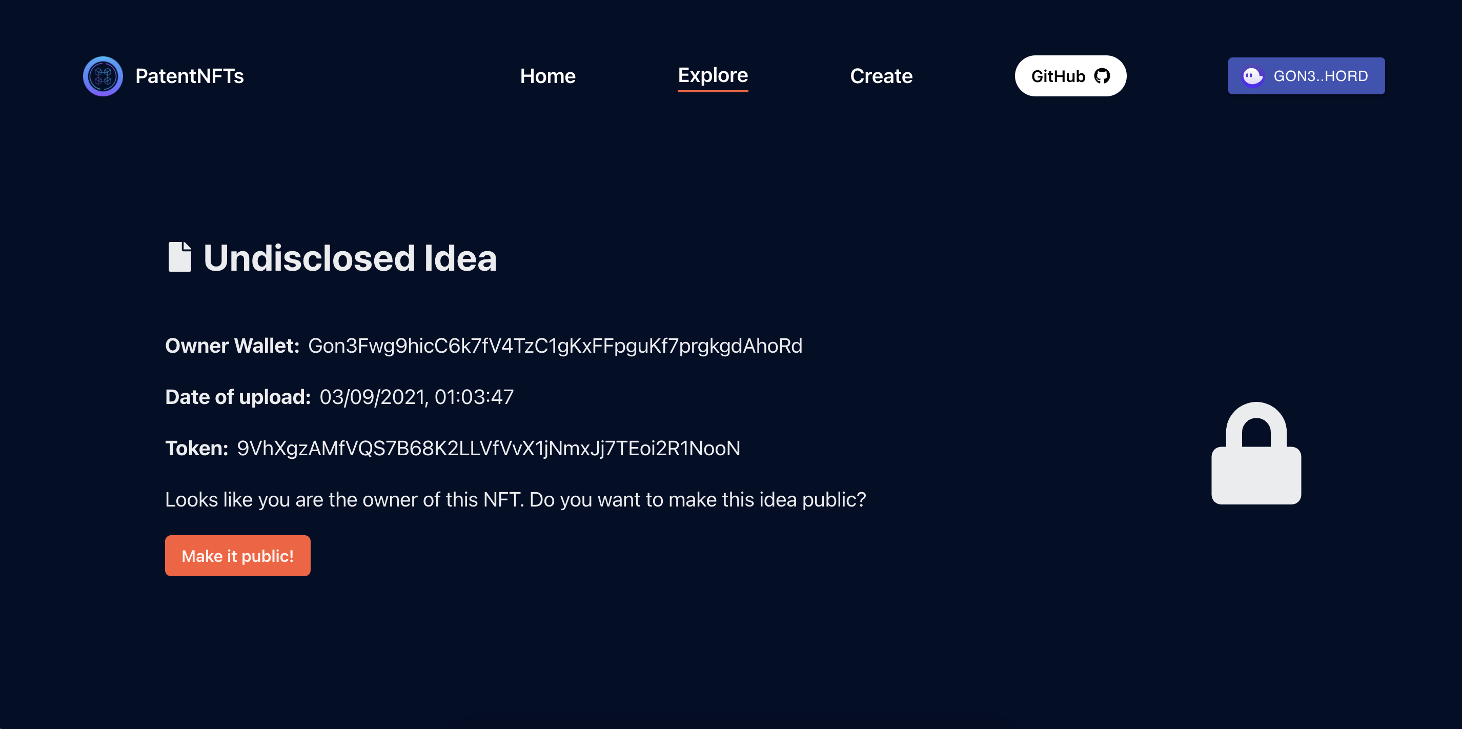 PatentNFT helps such ideators by letting them add a "proof of idea" on the blockchain as a unique token without actually adding their idea in clear on it. When the ideator decides to publicise the idea, they can prove that they thought about the idea back (when they uploaded the proof) using the proof existing on the blockchain. PatentNFT provides two guarantees -