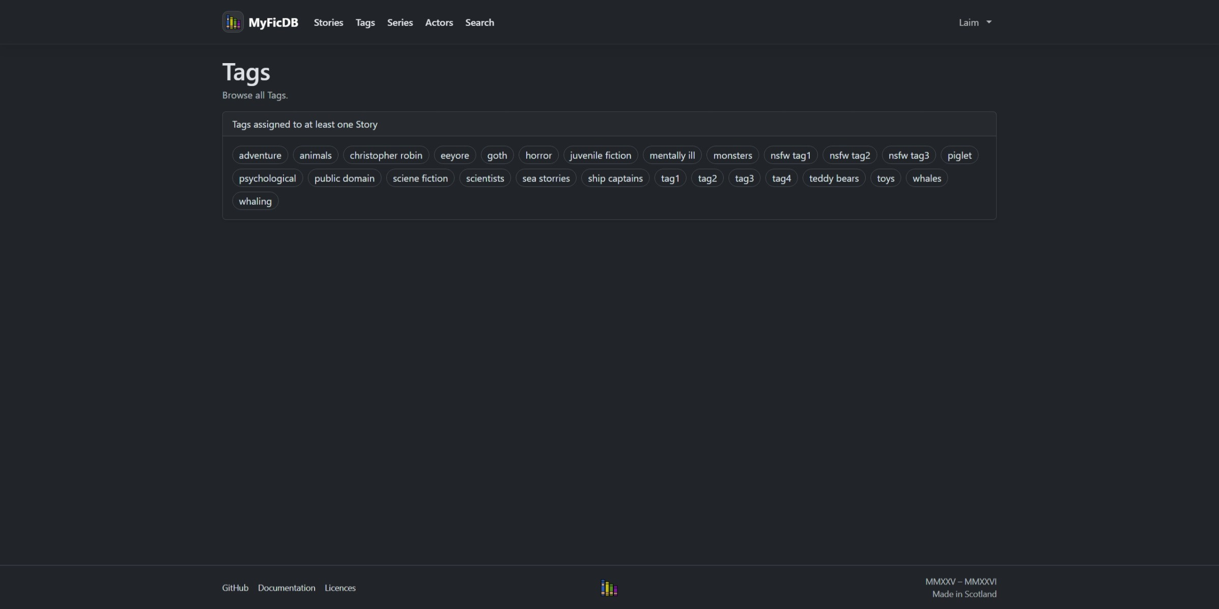 MyFicDB is a self-hosted single-user app similar to AO3 for hosting Fan Fiction. You can create multiple stories with chapters, assign tags, series and actors to each story.