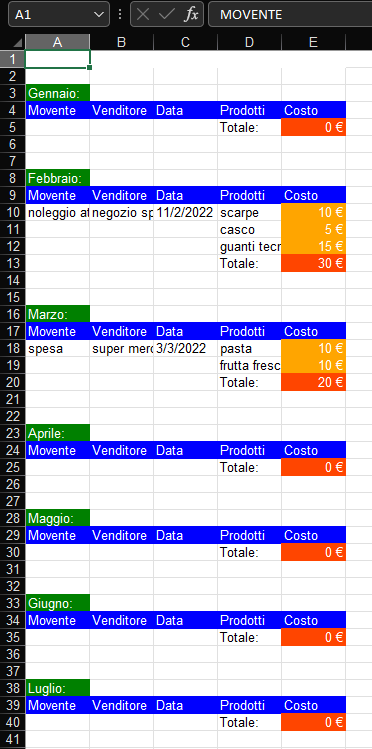 apertura in excel contenente suddivisione e totale per ogni mese: